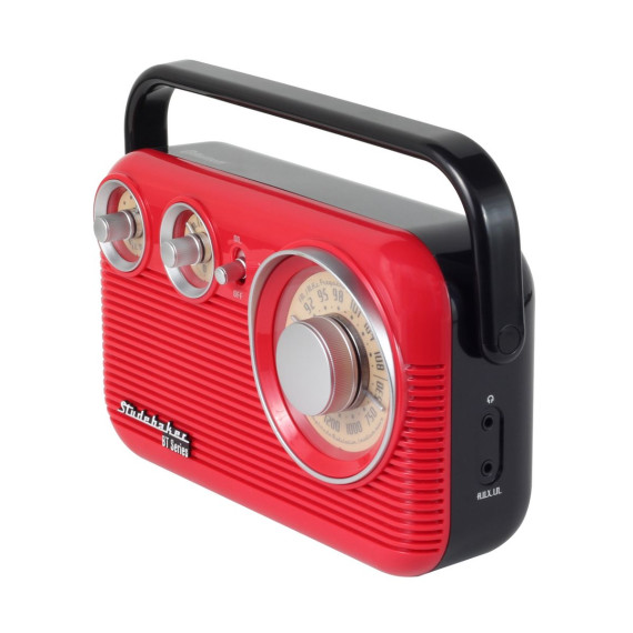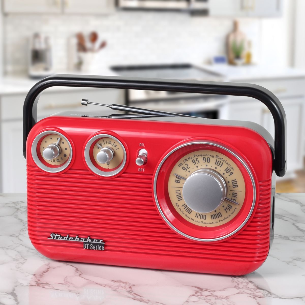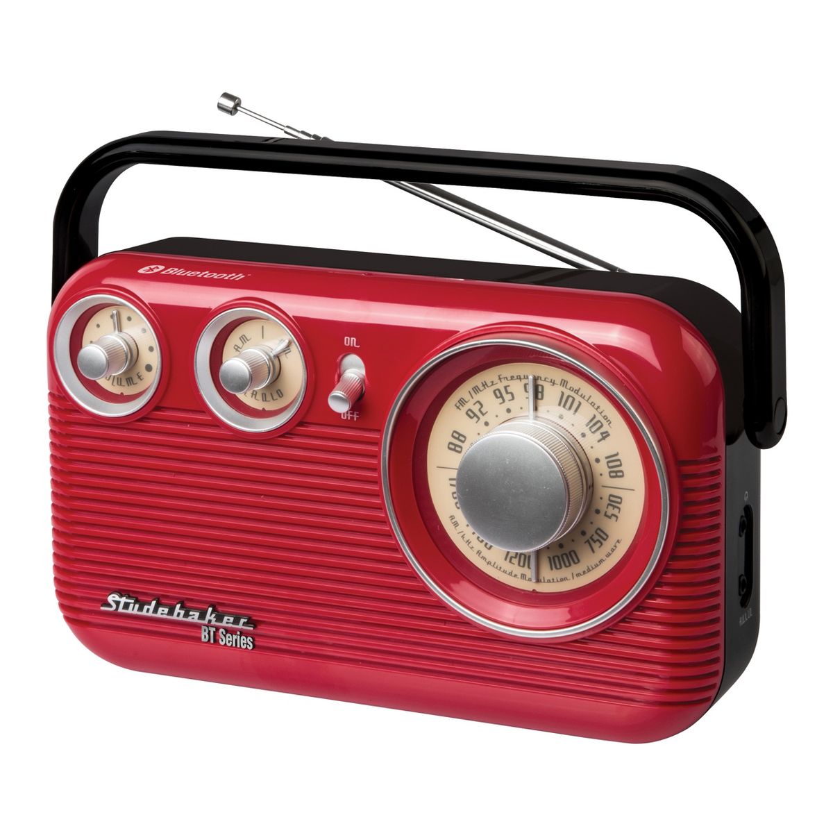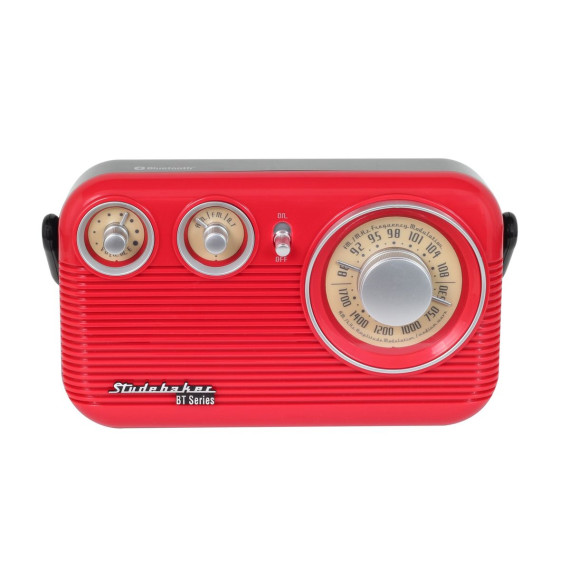 The Studebaker SB2003BT AM/FM radio is a retro portable radio with classic styling, and easy to use features. The large analog tuning knob simplifies adjusting to your favorite stations, along with AM/FM and volume knob controls as the speaker delivers excellent sound with clear and static-free audio. Play music from other devices like your tablet, iPod®, MP3 player or other digital audio players through the built-in auxiliary input jack, connect your devices with Bluetooth compatibility or even listen in peace, connecting your favorite pair of headphones using the built-in 3.5mm headphone jack. The compact, durable design features a carrying handle and telescopic antenna. It operates on 120V AC or on 4 x "C" batteries (not included), and makes the radio perfect for taking with you anywhere you go.