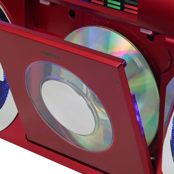 This retro Portable Boombox with AM/FM Analog Radio and Bluetooth connectivity for streaming music also features a front loading CD player that is CD, CD-R/RW and CD-MP3 compatible. Adds a USB MP3 playback port for playing music downloaded to a flash drive. A multi-color LED Equalizer adds an exciting visual to this awesome looking unit. This unit comes with an auxiliary input jack and headphone jack. Other great features include built-in stereo speakers, rotary volume control, treble and bass adjustments and a convenient carrying handle. 3-way power including a 10ft 12V car/boat adaptor make this boombox useable anywhere.