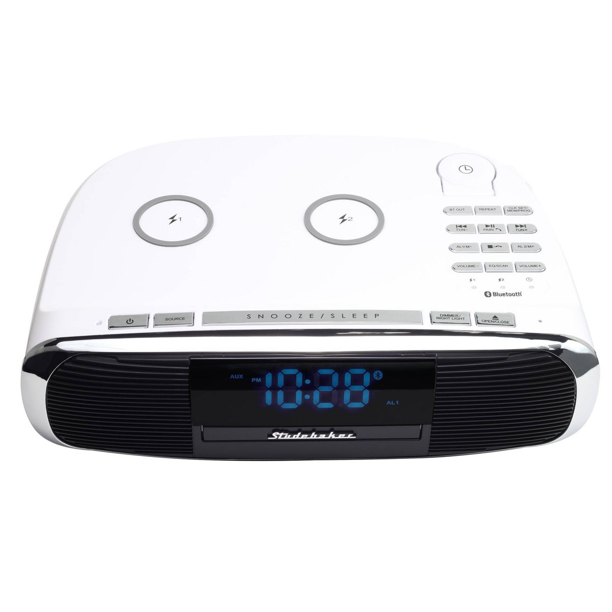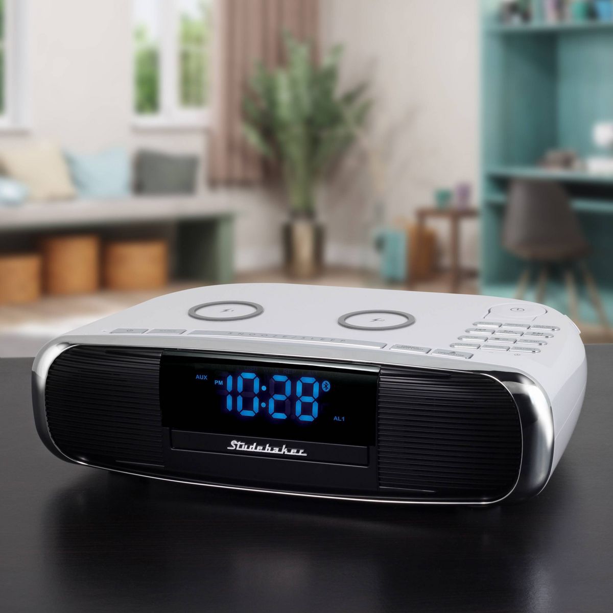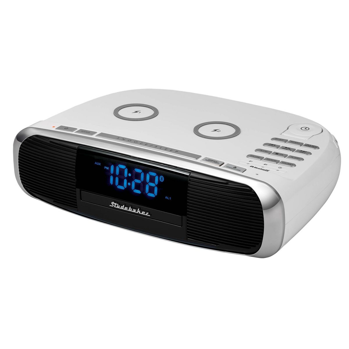 Say hello to the Studebaker Workstation! Is it a hi-fi sound system? Is it a Qi wireless charging pad? Is it a clock radio? Is it a CD player? Yes, yes, yes, and yes. Of course, the Workstation has both Bluetooth for streaming music and podcasts from your devices but also has Bluetooth out so you can use wireless headphones (or Air Pods) as well. Set this up and drop up to 2 smartphones, Air Pods, or maybe an Apple Watch on the wireless charging pad and go forward working, cooking, or just enjoying room filling music or privately with wireless private listening devices. If your phone rings, no worries, you can answer using Bluetooth and the on-board microphone. The remote control allows you to adjust everything from wherever you are in the room. The Workstation has it all: 4 EQ settings, auxiliary input jack, digital volume control and a 2.1A USB charging port. At the end of the night, you can be assured to get a good rest with the adjustable night light and dimmer control, and wake to your favorite FM radio station to check the news and weather to start your day.