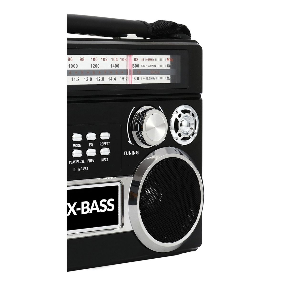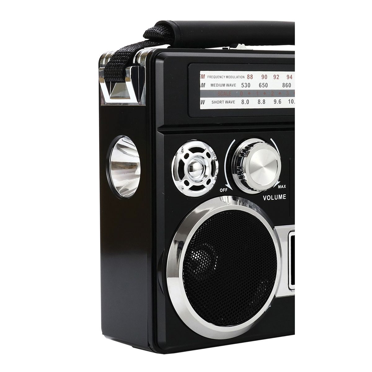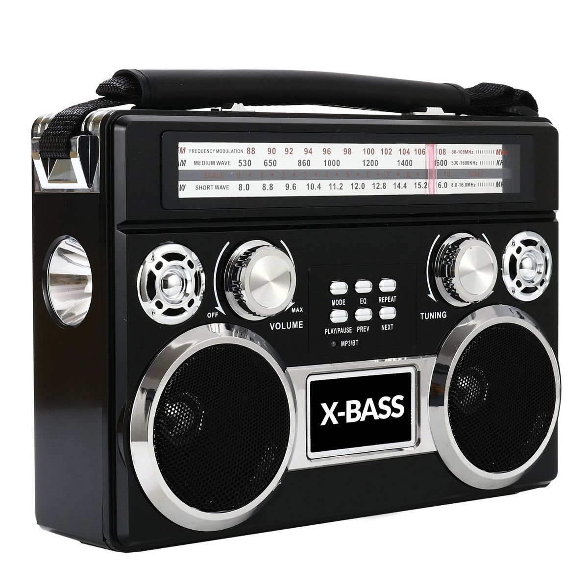 Take your tunes on the go! The Red Supersonic Portable 3-Band Radio with Bluetooth and Flashlight has a retro look. Its receiver can pick up AM and FM radio stations as well as shortwave radio bands. Built-in Bluetooth allows you to connect to your smartphone, tablet, laptop, computer, and more. This portable radio can also play MP3 files from USB drives and microSD Cards plus it has a 3.5-mm aux input so you can playback audio from non-Bluetooth devices. Additionally, there's a flashlight on the side and a handle so you can carry the AM/FM shortwave radio anytime day or night. This vintage-styled Bluetooth radio operates on AC power, but can also run on batteries, which are sold separately. Battery life is up to 10 hours for the flashlight and 2 hours for the radio.