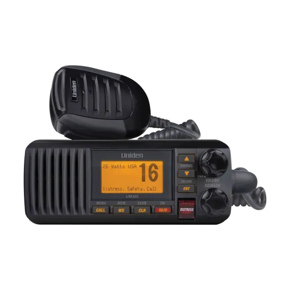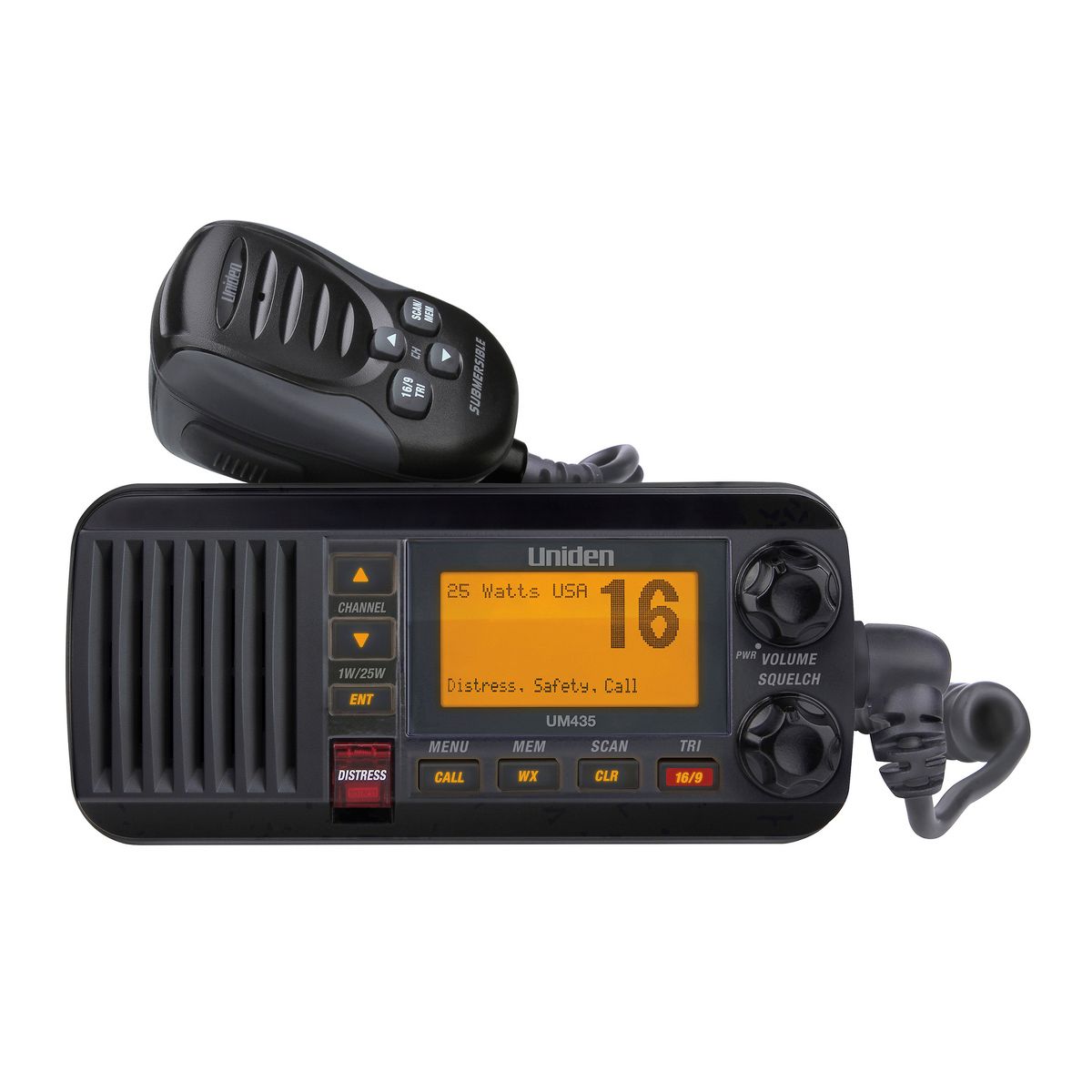 Submersible, rugged, reliable - say hello to the mariner’s most faithful companion. The Black Uniden UM435 25-Watt Full-Featured Fixed-Mount VHF Marine Radio is the ideal companion for even the most perilous seas. Its ultra-compact construction saves valuable space and allows for convenient mounting. The large backlit LCD display provides clear data to mariners. Its DSC (Digital Selective Calling) feature and NOAA® weather alerts ensure you stay out of harm's way by being informed of your surroundings. And its completely submersible design and IPX8 rating is equipped to handle the weather and the waves, while remaining your failproof lifeline to the information and communication that keeps you safe at sea. Whether facing rough waters or enjoying smooth sailing, the UM435 is easily within reach throughout it all.