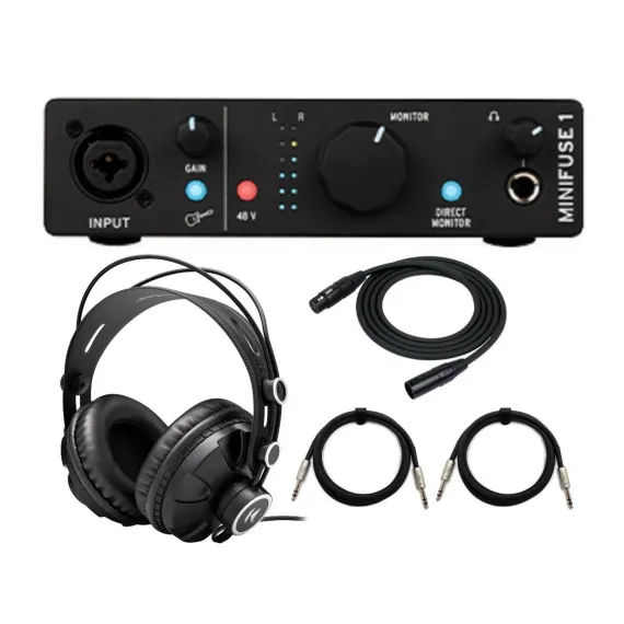 Arturia MiniFuse 1 Audio Interface The Arturia MiniFuse 1 Audio Interface includes Arturia instruments such as 500 vintage and modern keyboard presets with Analog Lab. It lets you make music and record audio wherever inspiration strikes, from your home studio to the great outdoors, with the MiniFuse 1 portable recording interface. Whether you are a solo guitarist, vocalist, budding content creator, or anything in between, enjoy sharp sound quality, smart features, and great software included as standard. The USB-C interface is compatible with PC and Mac. MiniFuse comes with an exclusive selection of software titles offering everything you need to give your sound the professional edge. Ableton Live Lite Lets you compose, record, perform and produce anything with an introduction to one of the most widely used musical software titles in the business. Tutorials Learn recording and music production with MiniFuse, starting with the basics. Exclusive Content Tips, tricks, and advice from industry experts. Dedicated Online Portal Access everything you need online in one place. Subscriptions Complimentary introductions to world-class audio and mixing services. Knox Gear TX-100 Closed-Back Studio Monitor Headphones Introduce your ears to a world of crystal-clear, expansive, high-fidelity audio with the TX-100 Closed-Back Studio Monitor Headphones from Knox Gear. These adjustable over-ear headphones are engineered for exceptional comfort, superior sound quality, and convenient portability anywhere you go. These headphones include a 1/4-inch adapter and feature an extra-long 10-foot cord for versatility. Noise Blocking Closed-Back Design Experience a crystal-clear high-fidelity audio soundscape with these closed-back headphones from Knox Gear. The TX-100s isolate your ears from unwanted external noise, preserving your bubble (and maybe your sanity) in loud environments. Closed-back headphones are the ideal listening companion when you want to isolate the most amount of external noise possible while keeping your focus dedicated solely to your audio of choice. The closed ear cups reduce the amount of outside sound that can seep in, making them the perfect choice for commuting and general noisy environments. Powerful Bass with Clear Mids and Highs Knox Gear headphones are engineered for maximum dynamic range and superior sound quality. 50 mm speaker unit drivers are coupled with neodymium magnets to deliver deep, rich bass, clear treble and vocals, and crisp high tones. For Recording, Music Production, Gaming No matter what your passion is, Knox Gear is the gear for your ears. Trusted by both audiophiles and professionals in the industry. The TX-100s are the perfect headphones for studio recording, production, gaming, and pure musical enjoyment. Knox Gear 25-Feet XLR Male to XLR Female Microphone Cable Knox Gear 25FT XLR Male - XLR Female Microphone Cable, is professionally designed to prevent external interference and ensure signals travel rapidly and smoothly with minimum distortion, delay, or loss. These cables feature two 20-gauge CCAM conductors, which are twisted pair with cotton yarn fillers, conductive PVC shield with 100% coverage, and CCAM spiral shielding with 90% coverage. Focus Camera by Kirlin 1/4-Inch TRS to 1/4-Inch TRS Cable The Focus Camera by Kirlin 1/4in TRS to 1/4in TRS Cable (6-Feet) is a heavy-duty cable for connecting your guitar or other electric instrument to an amplifier. Ideal for Gigging At 6 feet long, this cable is perfect for touring or live sound applications. This male-to-male cable can be attached to any standard amplifier from a guitar, bass, electric keyboard or other compatible instrument.