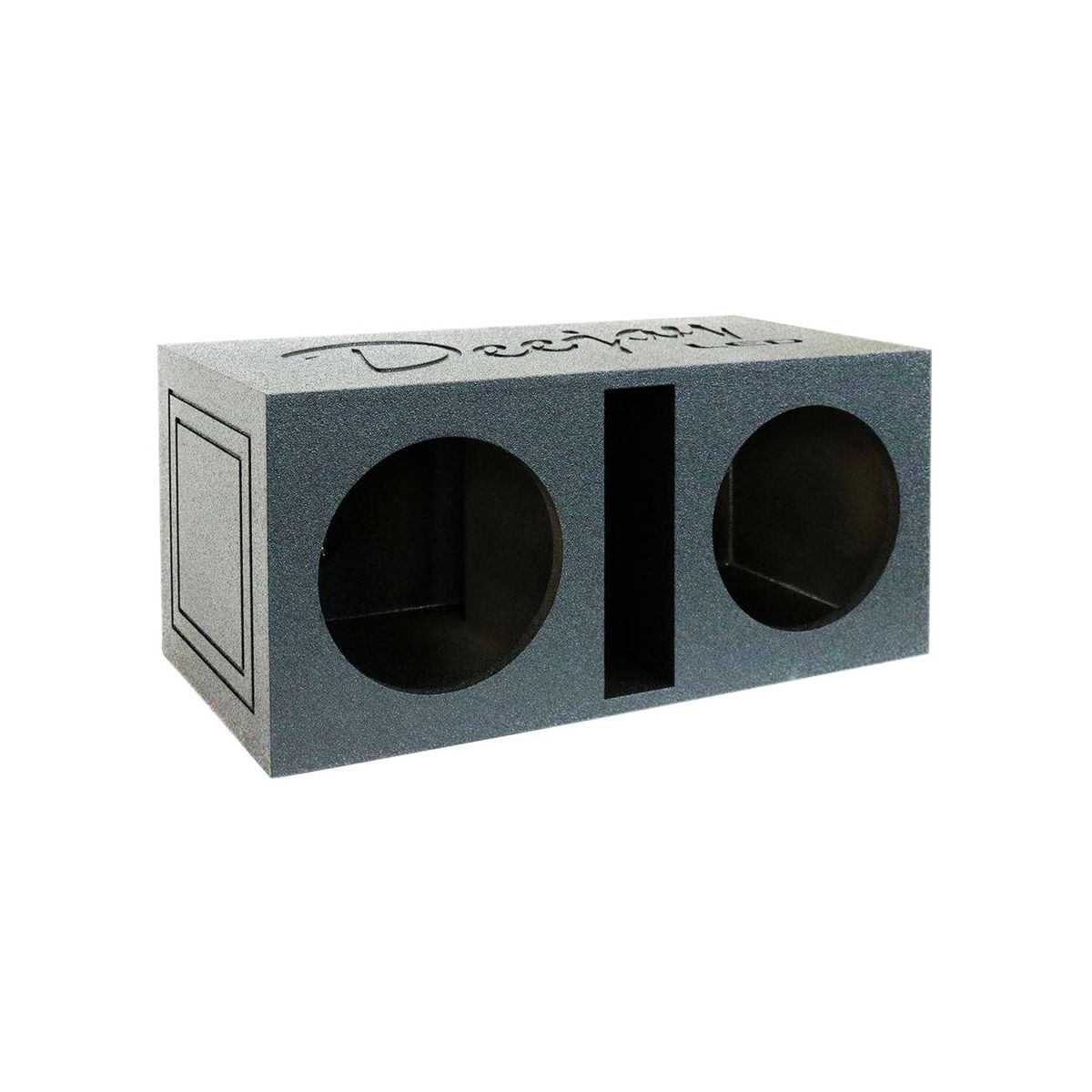 * Dual Central Tuned Ports w/Connected Central Air Chamber * Vented Design for Superior Bass Response * 9.05-in Round Openings for two 10-in Woofers * 17mm MDF Heavy Duty Construction * Heavy Duty Epoxy Coated Exterior with etched accents and etched logo