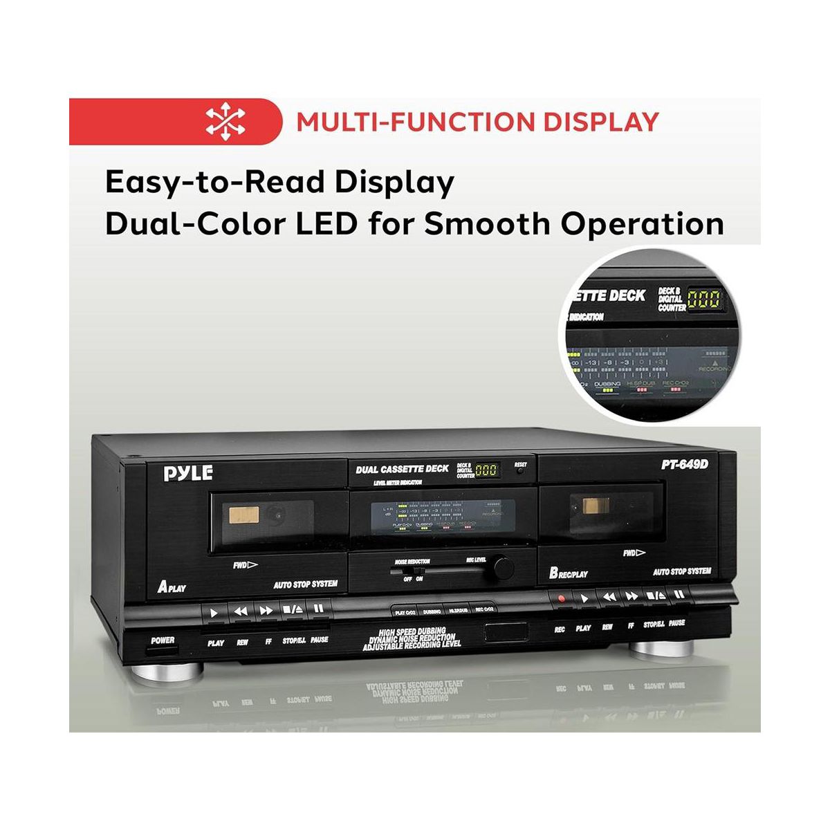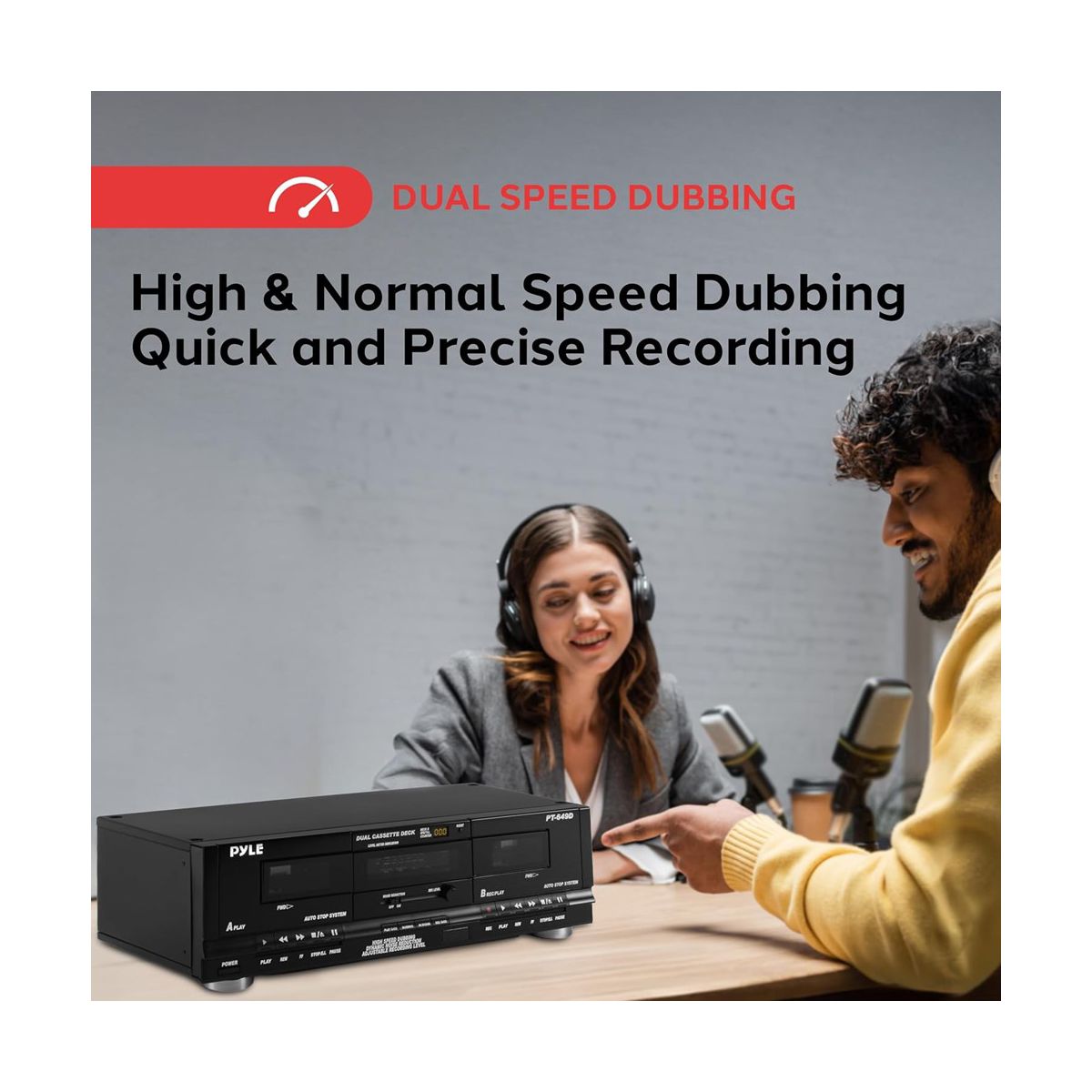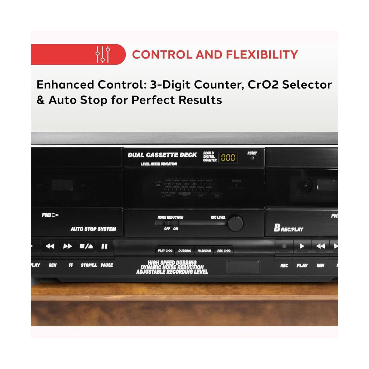 Dual Cassette Deck for Recording with High-Speed Dubbing, CrO2 Tape Selector, Compact Design