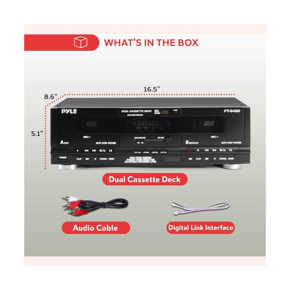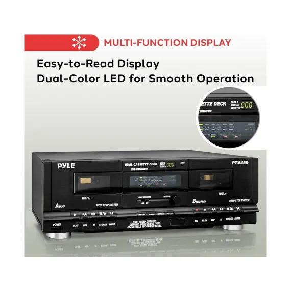 The Pyle PT649D.5 Dual Cassette Deck is the perfect system for mixtape creation and high-quality audio recording. With two independent tape deck slots and high-speed dubbing functionality, you can easily create playlists or duplicate tapes. The deck supports both normal and CrO2 high-bias tapes, allowing for versatile playback and recording. The system is equipped with digital counters, dynamic noise reduction, and front panel button controls for seamless operation. It also features RCA input/output connectors and comes with a rack-mountable design, making it perfect for home stereo setups and professional audio environments.