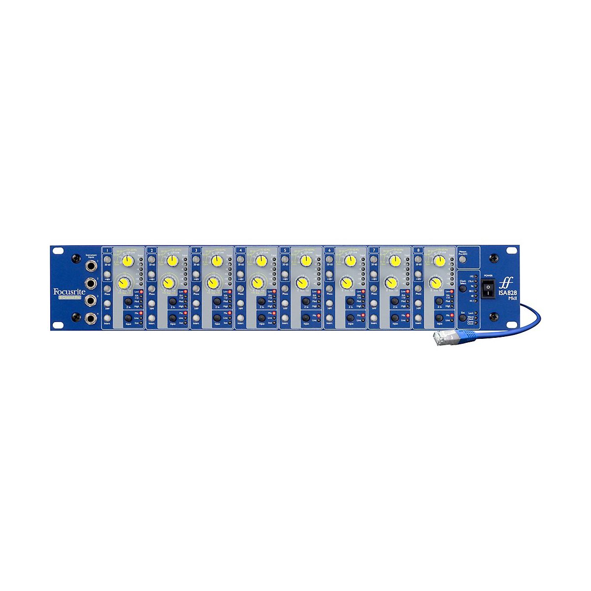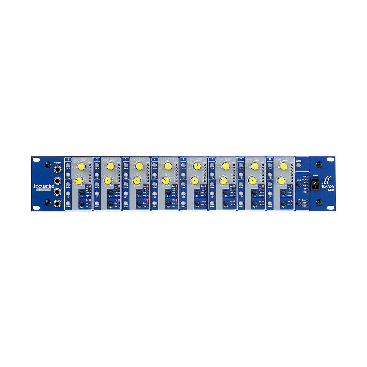 The ISA 828 MkII from Focusrite incorporates eight mic preamps, with Lundahl LL1538 transformers on every input. Each channel has the option of mic or line inputs, while inputs 1-4 also feature instrument inputs on the front panel. Each mic pre has variable input impedance, to provide a range of subtly different sonic options when using microphones, including an "ISA 110 setting, which replicates the impedance of the original Focusrite mic pre.The ISA 828 MkII features high-pass filters, six-segment LED meters and switchable rear-panel insert points, which allow the use of inline processors such as compressors or EQs. Up to 60dB of gain is available, with a further +20dB of continuously variable trim, providing a huge 80dB gain range. Dedicated connectors for mic and line-level inputs allow all sources to be connected simultaneously, making the Focusrite ISA 828 MkII perfect for permanent installation in a rack.Now comes with Brainworx bx_console Focusrite plug-inThis awesome plug-in recreates the analog signal paths of Focusrite’s revered ISA 110 and ISA 130 modules, which were a part of the Focusrite Studio Console. Designed and coded by the DSP geniuses at acclaimed software house Brainworx, the new bx_console Focusrite VST/AU/AAX plug-in for Mac and PC faithfully captures the sound, feel and styling of the original iconic hardware.If purchased any Red, RedNet or ISA solution from January 2020 on, will have the plug-in available in Focusrite account as long as ’ve registered product.