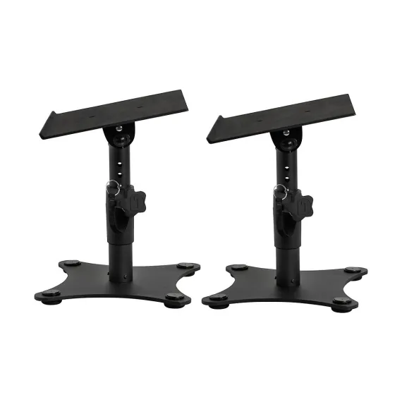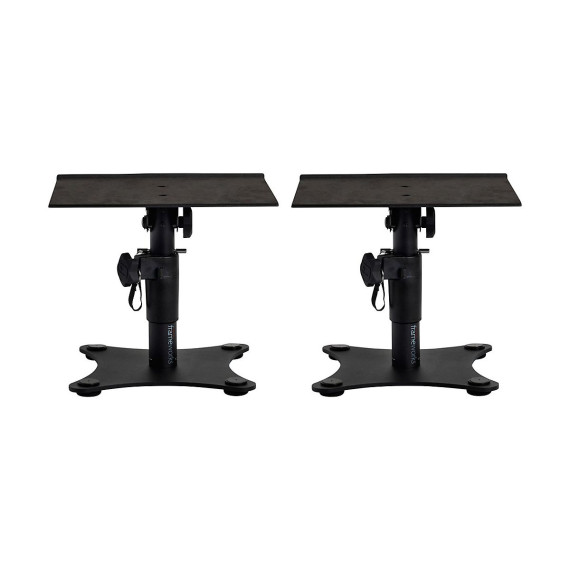 This pair (2) of Gator Frameworks Desktop Studio Monitor Stands features a12"/305mm x 9"/229mm speaker platform with a soft, EVA-lined surface. It fits most small-sized studio monitor speakers, both vertically and horizontally. The multipurpose top deck surface holds MacBook Air and Pro models.