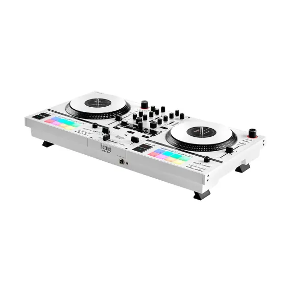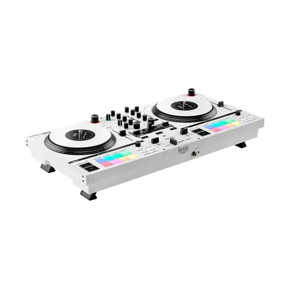 The DJControl Inpulse T7 in limited-edition white is the ultimate tool for aspiring DJs eager to master the art of vinyl turntables. Featuring two motorized platters with genuine vinyl discs and felt slipmats, this controller delivers an authentic turntable experience in a compact, digital-friendly format. Whether 're learning to scratch, beatmatch or mix, the Inpulse T7 bridges the gap between classic vinyl techniques and modern DJ technology, helping develop skills with ease and confidence.
