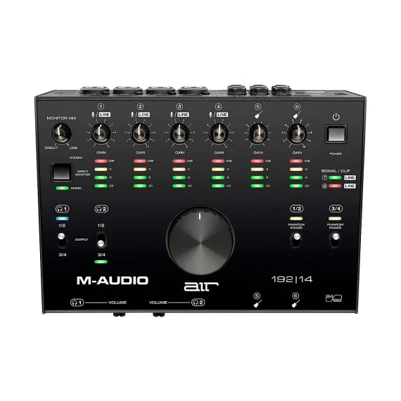 With the AIR 192|14, can create 24-bit/192kHz studio-quality recordings with an intuitive and easy-to-use audio interface. Boasting an elegant pro-grade metal chassis with a large central volume knob, the AIR 192|14 features the exclusive Crystal low-noise preamps and pristine A/D converters that deliver the highest audio performance in its class.The AIR 192|14 features four XLR+1/4" TRS combo inputs, two 1/4" line inputs and two 1/4" instrument inputs that have a specially designed gain and impedance stage to provide the most accurate representation of a guitar or bass plugged directly into the interface. The AIR 192|14 has as a stereo pair of 1/4" main outputs, and two 1/4" assignable outputs. Two musicians can have their own separate mixes while recording using the two 1/4" headphone outputs with independent source and level controls.The AIR 192|14 connects to Mac or PC via a standard USB or USB-C port using one of the two included cables. This premium Hi-Speed USB connection enables to have zero-latency monitoring of inputs, making the recording process easier than ever.The overall combination of professional audio performance, easy-to-use features and the included AIR Series software bundle make the AIR 192|14 an amazingly versatile, high-performance audio interface that will conquer any recording session with ease. Included Software to Match StyleThe AIR 192|14 comes complete with a software package that has everything to get started making professional recordings right out of the box, including popular DAW Ableton Live Lite. Ableton Live Lite is one of the most popular performance and production programs available in the world. A powerful music creation tool, Ableton Live Lite enables musicians and producers to spontaneously compose, record, remix, improvise and edit musical ideas in a fluid audio/MIDI environment.They’ve also added an entire Effects Plug-in, Virtual Instruments and Loop package to cater to all production needs. Whether need a guitar tone, reverb or delay they’ve got effects needs covered with Eleven Lite, 20 effect plug-ins and AIR’s Creative FX Collection Plus. With the included AIR Virtual Instrument plug-ins, ’ll have a virtual drummer, drum machine, synth, strings, percussion, organ and piano plug-ins to add world-class-sounding instruments to songs with ease.The Heart of Studio, Right on DeskThe M-Audio AIR 192|14 is an 8-in 4-out feature-packed USB audio/MIDI interface that provides all of the connections and software need to easily create professional 24-bit/192kHz studio-quality recordings. Boasting an elegant pro-grade metal chassis with a large central monitor volume knob, the AIR 192|14 features the exclusive transparent low-noise Crystal preamps and pristine A/D converters that deliver the highest audio performance in its class. The AIR 192|14 features four XLR+1/4" TRS combo inputs, two 1/4" line inputs and two 1/4" instrument inputs that have a specially designed gain and impedance stage to provide the most accurate representation of guitar or bass when plugged directly into the interface, along with a MIDI input and output. The AIR 192|14 has a stereo pair of 1/4" studio monitor outputs and two 1/4" assignable outputs. Two musicians can have their own separate mixes while recording by using the two 1/4" headphone outputs with independent source and level controls. The AIR 192|14 can connect to either the standard USB A port on Mac or PC or the USB-C port. Cables for both are included: A USB-C to C cable and a USB-C to A cable