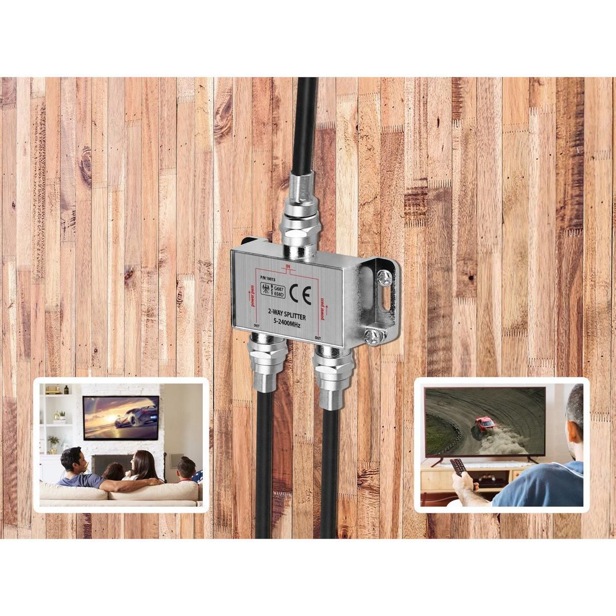 This premium signal splitter divides a single coaxial cable input into multiple separate signals, allowing several devices to receive the same signal simultaneously. It maintains strong signal quality with minimal loss, making it ideal for home use with TVs, DVRs, and other coaxial-connected entertainment devices. Durable and reliable design.