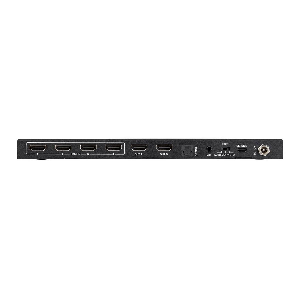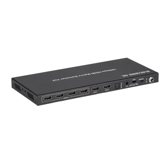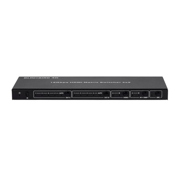 This Blackbird 4x2 HDMI Matrix allows you to distribute any of four HDMI sources to one or two HDMI displays. It fully complies with the HDMI 2.0b and HDCP 2.2 and 1.4 specifications. It supports video resolutions up to 4K@60Hz with YCbCr 4:4:4 color space. The audio from Output A can be de-embedded to optical multichannel and analog stereo outputs, while the video from Output B can be scaled down to 1080p, if the display does not support 4K. It provides smart EDID management, with 16 different EDID configurations to meet most use cases.