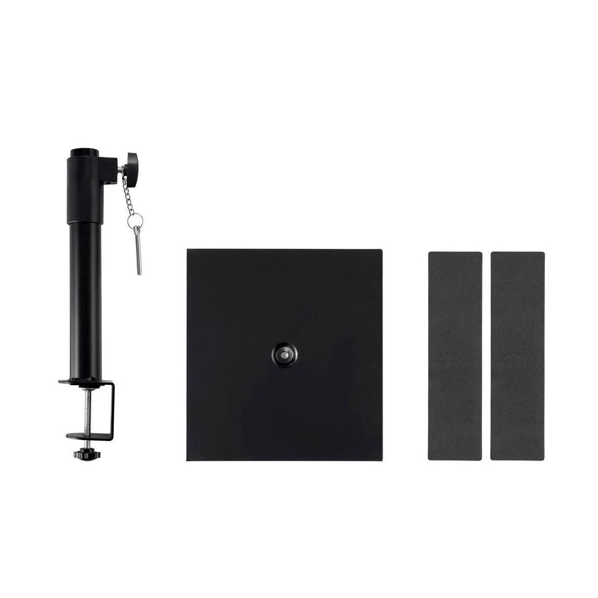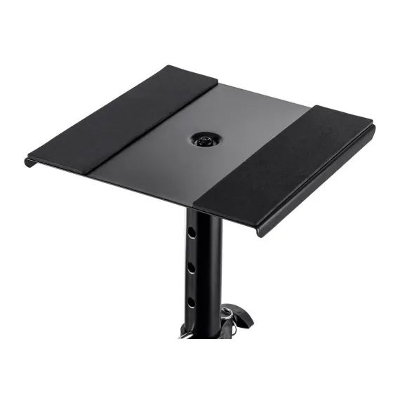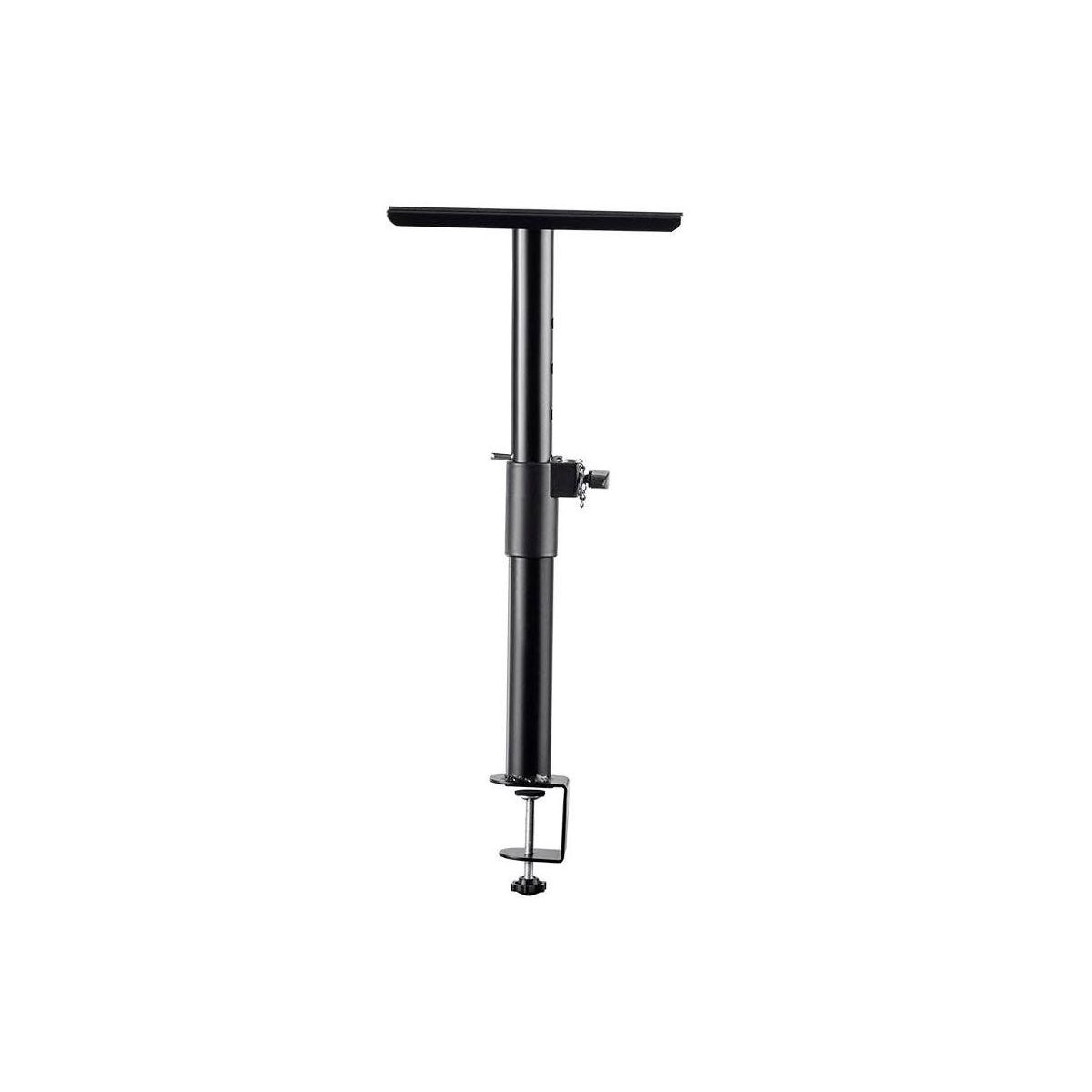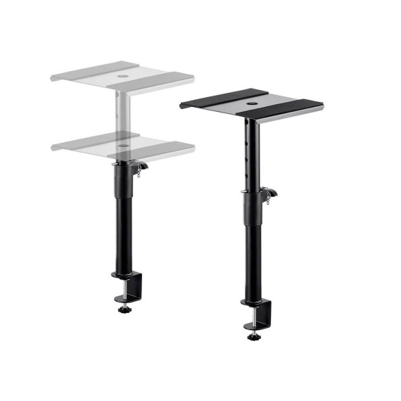 When setting up your home studio, monitor stands are key. They are both useful at keeping your speakers secure and can make a huge difference in your sound, as monitor placement is critical for proper mixing. If you've ever used conventional, floor standing monitor stands, you know they need some floor space, as support for a 4' stand will require ample footprint. Here's where the Stage Right clamp mounted desktop studio monitor stands come in. They provide the benefits of traditional monitor stands, without the footprint. For instances where floor space is limited, Stage Right desktop stands may be the ideal solution for your monitors. Made of steel, Stage Right desktop monitor stands are height-adjustable, allowing you to place your monitors between 12" and 18" above the height of your desk. Their clamp will work on desk surfaces up to 40mm thick. The top platform is 9" x 9", providing sufficient surface area to support monitors up to 8". For additional stability, Stage Right desktop monitor stands include anti slip pads and can support up to 22 lbs.