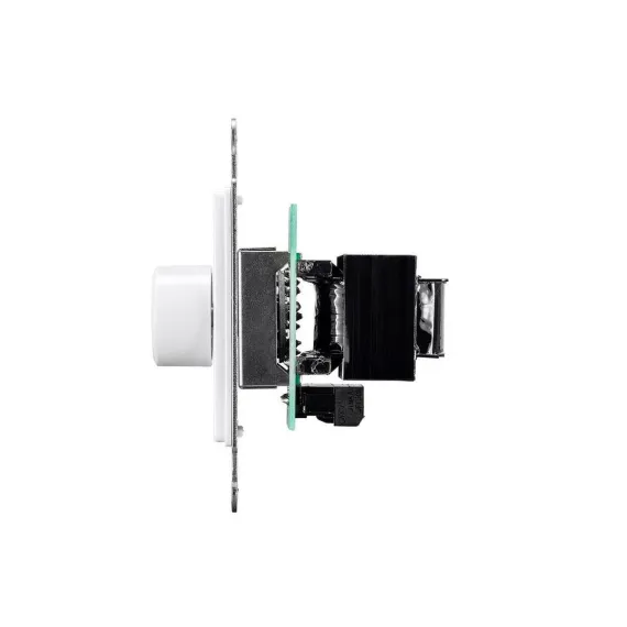 The RVC25-70 is an in-wall, inline volume control for 70V music systems. It features 11 volume positions with make-before-break contacts. It supports a maximum load of 25 watts and can fit into a single gang junction box, while two RVC25-70 volume controls or one RVC25-70 and one RVC-50-70 can fit side-by-side into a dual gang box.