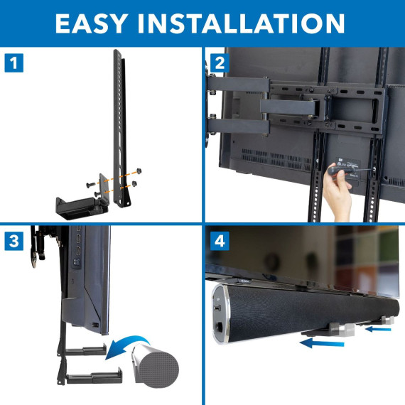 Enjoy optimum sound quality by mounting your soundbar on the wall or directly to your TV. Mounting the soundbar either to the top or bottom of your TV allows you to swivel it with the TV, making it great for those awkward mounting locations. This two-in-one mount allows you to remove the arms from the TV mount, creating a low-profile wall mount if preferred. It is compatible with most TVs with standard VESA patterns and soundbars between 3.5 and 6.1 inches.