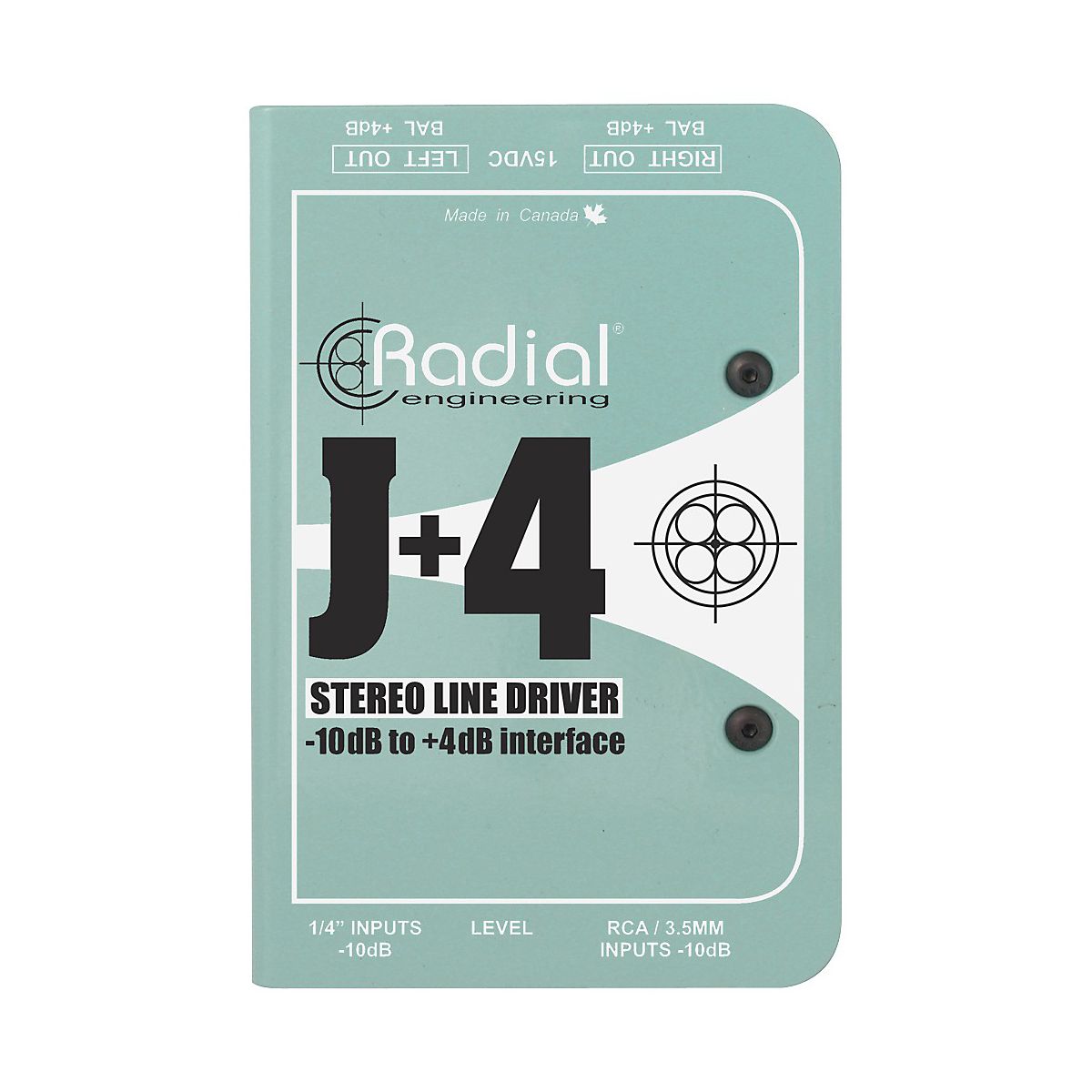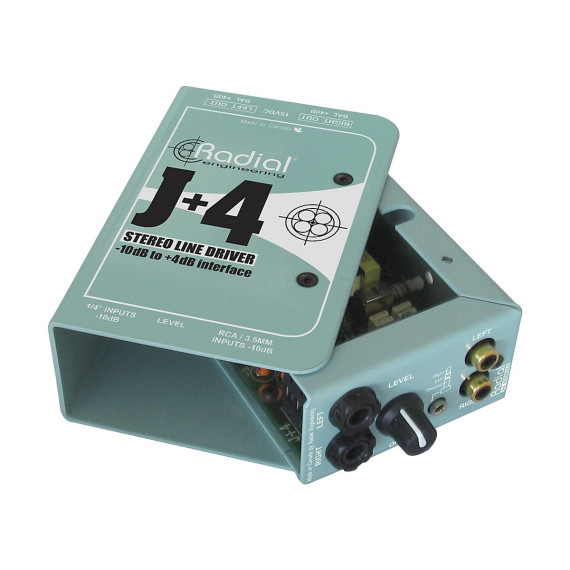 The Radial Engineering J+4 Stereo Line Driver accepts consumer level -10dB unbalanced high impedance signals and converts them to +4dB balanced low impedance signals. If needs involve pro audio, whether in broadcast, recording studios, or live touring, 'll find the Line Driver box invaluable. Radial paid careful attention to noise elimination by combining the advantages of active signal buffering with transformer isolation. The J+4 delivers better than 95dB signal-to-noise. It also keeps hum and buzz caused by ground loops and spurious clocking noise from polluting the signal path. For reliability and ease-of-operation, Radial kept controls on the J+4 to a minimum. Input connectors include a stacked set of 1/4" jacks for DJ mixers or keyboards, RCA's for CD players and a mini 3.5mm for I-pods. High Pass Filter - The Radial stereo J+4 is equipped with a handy high-pass filter that is used to cut low frequencies below 100Hz. This provides several important benefits. First and foremost, when playing back audio tracks through a PA system, excessive bottom end can produce low frequency resonance which in turn can cause runaway feedback. It is also important to note that bass frequencies contain significantly more energy than higher frequencies. Reducing bass content can dramatically increase system's dynamic range. Finally, by reducing unneeded low frequencies, it really helps clean up the mix. Built tough - As with all Radial products, the Radial J+4 is built tough to handle the extreme rigors of professional touring. A unique 14-gauge steel I-beam inner frame ensures the sensitive PC board will not be subjected to outside stress which could potentially cause solder joints to fail. An innovative book-end outer shell creates protective zones around the sensitive controls, switches and connectors to further improve dependability while a full bottom no-slip pad provides both mechanical and electrical isolation. The Radial J+4 balanced line driver delivers exceptional sonic performance, plenty of headroom and ultra-low noise making it the ideal companion in today's more demanding professional audio systems.