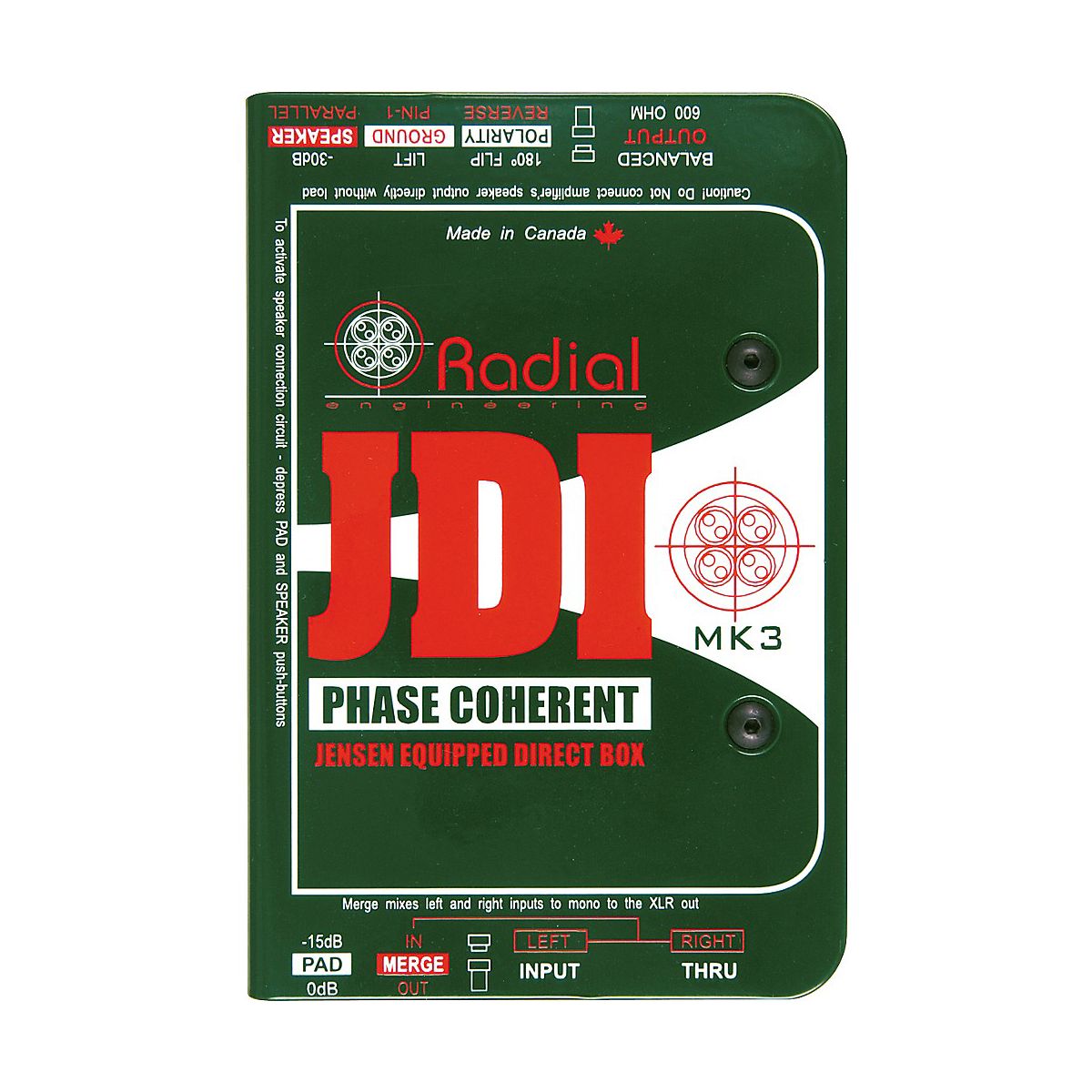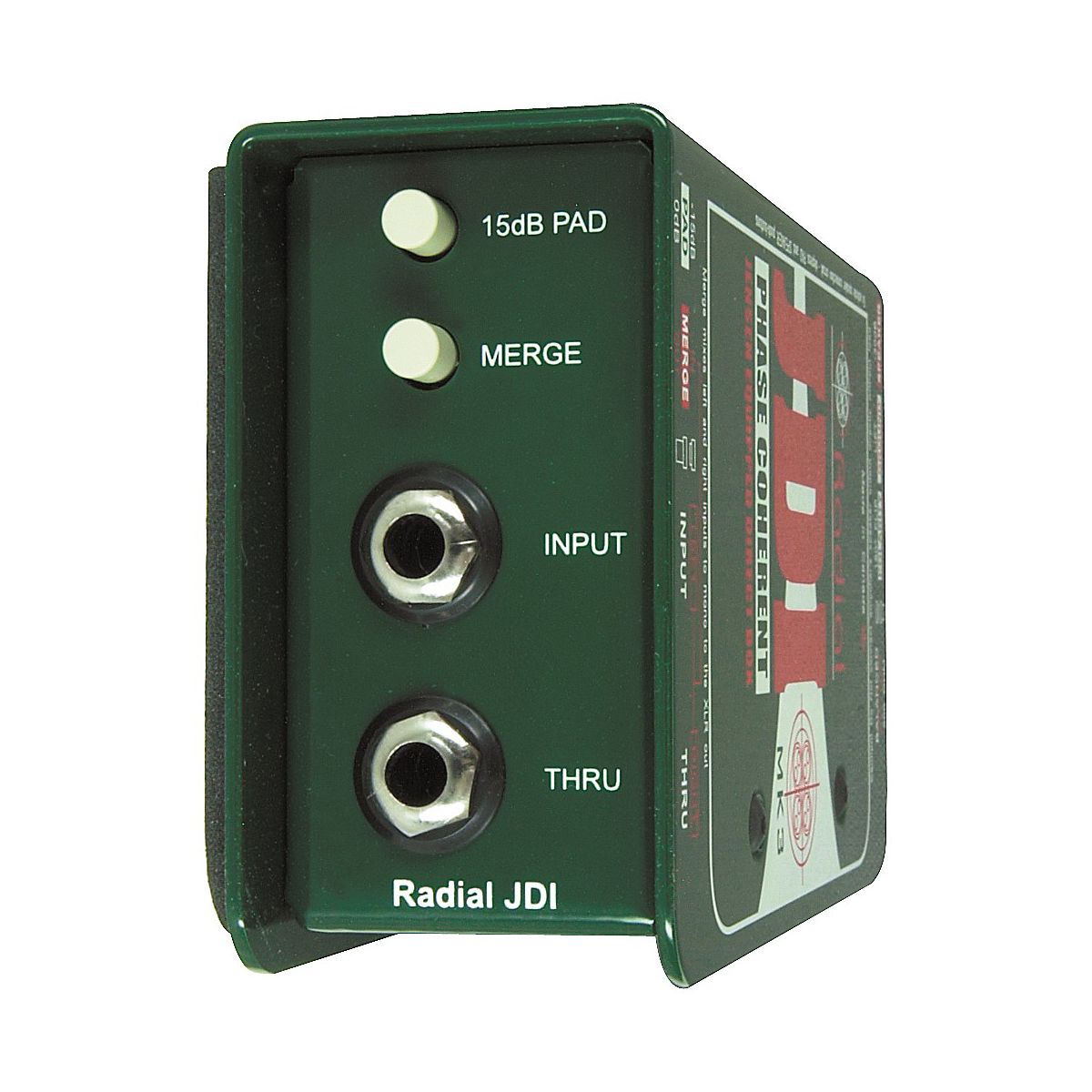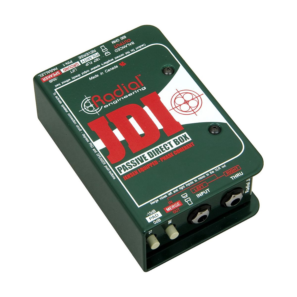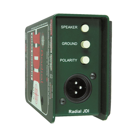 The Radial JDI MK3 Passive Direct Box is a Jensen transformer equipped, high-quality passive direct box that has the advantage of providing complete isolation for reduced noise. The exceptionally low phase distortion, almost perfect linear response, and low harmonic distortion make the JDI direct box a superb choice for recording or live performance. The rugged construction allows it to be used in abusive environments without concern. The Radial JDI Mk3 is ideal for acoustic guitars, bass, and keyboards. Considered by many to be one of the finest passive-operation direct boxes available, this Radial DI employs a Jensen isolation transformer for optimum audio performance. 60-cycle ground loop elimination and adept handling of high-output, active instruments and keyboards make the Radial JDI discrete and versatile. Steel I-beam construction, baked enamel finish, and protected faceplate mean Radial JDI is built to survive. The Radial JDI passive direct box employs the Jensen JT-DBE transformer as its main drive engine. The Jensen DBE transformer employs a laminated nickel core with low-permeability and no magnetic memory, therefore eliminating phase distortion caused by the disruption of fundamentals and harmonics. The distinctive book-end design protects the switches against damage from abuse by providing a protective zone on both I/O panels. A baked enamel finish resists scratching while a no-slip rubberized pad on the bottom stops the JDI direct box from moving around and aids isolation. Inside, the Radial JDI features compound, welded I beam construction that protects the sensitive electronics from outside stress. The internal skeletal frame is locked together with 4 hex screws. The input panel features a 1/4" instrument input and traditional thru-put. An innovative merge function allows the thru-put to be converted to a second input to allow stereo to mono summing. This is useful for interface with stereo sources such as keyboards or CD players in live shows where audio channels may be not always be plentiful. The Radial JDI also sports a -15dB pad to interface with higher output levels. The output panel features a balanced 600-ohm XLR connector with pin-2 hot following the AES specification. A polarity reverse switch toggles pin-2 and pin-3 to allow the JDI direct bpx to interface with older non-AES equipment and for creative tinkering. The ground lift switch disconnects the XLR pin-1 ground from the Radial JDI for 100% input-to-output isolation. A second -30dB pad used in tandem with the -15dB input pad allows the JDI to be connected in parallel with a speaker. This, for instance, allows the engineer to tap the sound coming from a guitar amplifier speaker post-distortion thus adding another creative dimension. This unique function incorporates a speaker emulation filter circuit. The JDI input features a high 10kOhm input impedance for minimal loading. This makes the Radial JDI ideal for interface with all instruments. The 600-ohm mic level output allows the JDI box to be used with typical snake systems that incorporate bridging transformers (splitters) without fear of overloading them. As a passive device, the JDI direct box is particularly ideal for use with high output devices such as active or self-powered instruments such as acoustic guitars and basses with built-in battery-powered preamps, and AC-powered equipment such as drum machines, DJ mixers, and keyboards. These devices tend to overload most active direct boxes making them sound thin and edgy. The Radial JDI direct box is capable of exceptionally high signal handling without distortion.