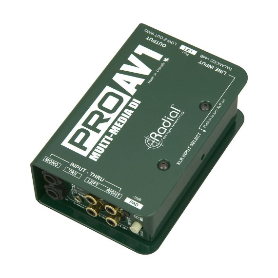 The Radial ProAV1 is a passive direct box specifically developed with the audio-video integrator in mind. The ProAV1 features a variety of stereo inputs that are merged via a resistive mixer to mono, greatly simplifying signal management. To eliminate the need for various adapters, a "Swiss Army" array of connections are provided, including 1/4" for instruments, RCA and 1/8" connectors for consumer electronics and computers, and a +4dB XLR input(s) for professional systems. Front panel connectors can also be used as thru-puts to allow multiple patch points. Custom-wound transformers are employed that are able to withstand exceptionally hot levels while maintaining linearity from 20Hz to 18.5kHz. The resulting smooth Bessel curve is warm and natural, making the AV1 particularly adept at handling digital sources that can sound harsh. Transformer isolation adds the benefit of eliminating ground loops that cause audio hum and buzz and video hum bars or snow. The ProAV1 direct box is ideal for events that interlace audio with video where music sources can include iPods, CD players, and video decks. The Radial ProAV1 will be a welcome addition to the AV technician's tool box. ProAV1 Direct Box Setup: - Plug audio-video device into the ProAV1 using any number of connection options from XLR to 1/8" mini connector. L & R Stereo inputs are paralleled to the unused L & R input connectors so can use these as thru-puts to connect to other devices or destinations. Stereo inputs are summed to mono at the XLR output. See the user manual for complete details about all the connection possibilities. A -15dB pad is provided to tame hot signals and the ground lift eliminates hum and buzz caused by ground loops. Application note:If can only plug into one channel, or mixer is set for mono output, just using a single mono cable or one side of the Y cable won't work. 'll lose half of stereo mix. If want to run mono (especially for long distances), the Radial ProAV1 will sum the stereo outputs to balanced mono and provide transformer isolation to protect equipment from phantom power traveling back to the unit (causing it to burn out). Never, we repeat, never try to combine two signals into one with a Y cable or use a single mono cable. Here's why: Outputs are low-impedance and always must be connected to a high-impedance input. If tie the two outputs together (with a Y cable or mono cable), each output will try to drive the other, which can force them beyond the safe current limit and possibly into short circuit. At minimum, will experience a severe loss of signal. Worst case; can damage iPod or laptop. To avoid this, a resistive mixer is required-such as that found in the Radial Engineering ProAV1. Remember, a Y cable that splits one signal into two is okay (stereo to 2 x mono). Combining two signals into one is right out!