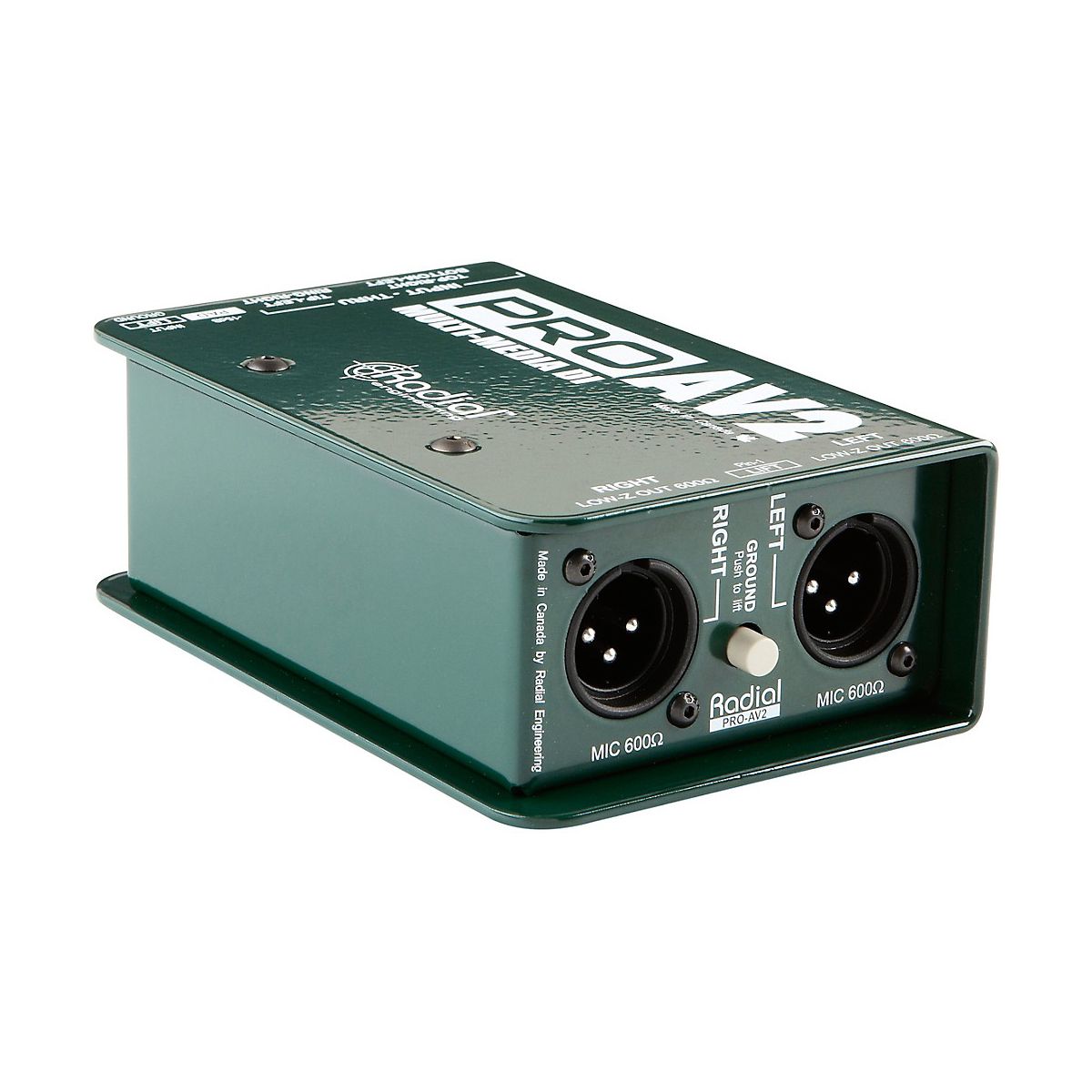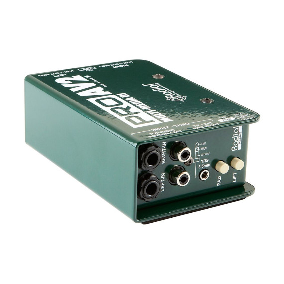 The Radial ProAV2 is a passive direct box specifically developed with the audio-video integrator in mind. It has full two-channel stereo functionality. To eliminate the need for various adaptor, a "Swiss Army" array of connections are provided, including 1/4" for instruments, RCA and 1/8" connectors for consumer electronics and computers, and a +4dB XLR input for professional systems. Front panel connectors can also be used as thru-puts to allow multiple patch points. Custom wound transformers are employed, which are able to withstand exceptionally hot levels while maintaining linearity from 20Hz to 18.5kHz. The resulting smooth Bessel curve is warm and natural, making the ProAV2 Passive DI box particularly adept at handling digital sources that can sound harsh. Transformer isolation adds the benefit of eliminating ground loops that cause audio hum and buzz and video hum bars or snow.