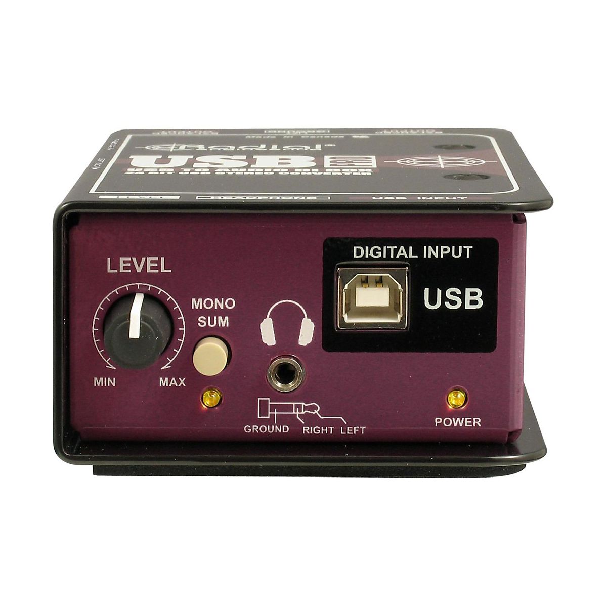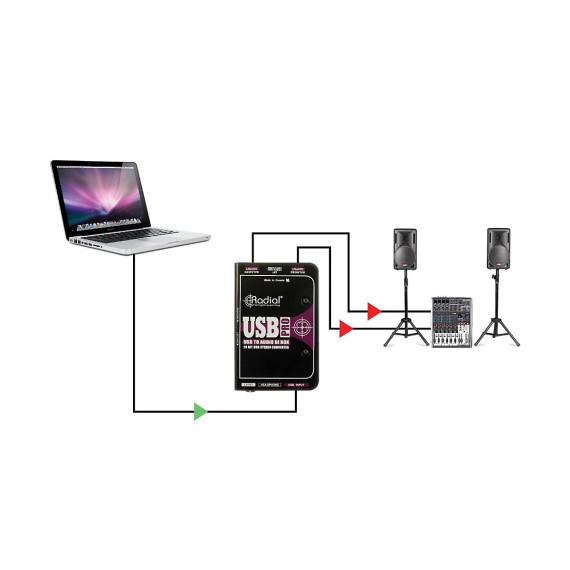 The Radial USB-Pro is a high-resolution stereo direct box designed to convert sound files from a laptop computer and seamlessly transfer them to a pair of balanced audio outputs to feed a PA, recording or broadcast mixing console. The USB-Pro automatically configures itself for use with all popular operating systems including Mac OSX, Windows XP, Vista and Windows 7, thus eliminating the need to load special drivers. Unlike devices that are limited with 16 bit, 44.1kHz conversion rates, the USB-Pro elevates the performance with true 24 bit, 96kHz stereo converters to deliver more headroom and greater detail. This eliminates the need for additional sound cards or separate converters when transferring files, further streamlining production in busy work environments. Connection from the laptop is done via the 'pro-audio standard ' USB type-B port. Digital-to-analog conversion is monitored with the built-in headphone amplifier to ensure the signal is being properly downloaded and converted. A mono-sum switch may be engaged to check for phasing or facilitate signal distribution to two outputs should this be preferred. One simply sets the output volume control to suit. Should hum or buzz caused by ground loops be encountered, two 'set & forget' side-access switches let insert isolation transformers into the signal path to block stray DC voltage offsets. To further reduce susceptibility to noise, this is augmented with a ground lift switch that lifts pin-1 on the two XLRs. As with all Radial products, the USB-Pro is designed to handle the rigors of professional touring. The unique book-end design creates protective zones around the switches, connectors and controls to keep them out of harm's way. Inside, Radial's time-tested I-beam construction assures the sensitive internal PC board will not torque which could otherwise cause premature part failure. Finally, a full bottom no-slip pad provides mechanical isolation and electrical insulation, further advantaging the user.