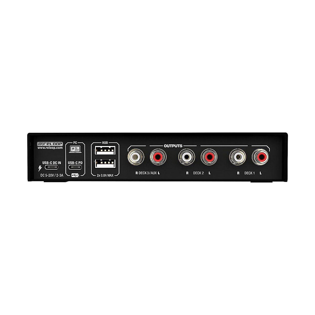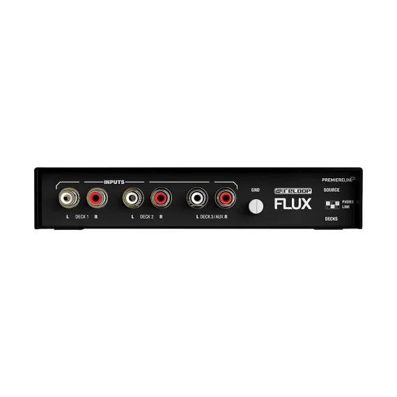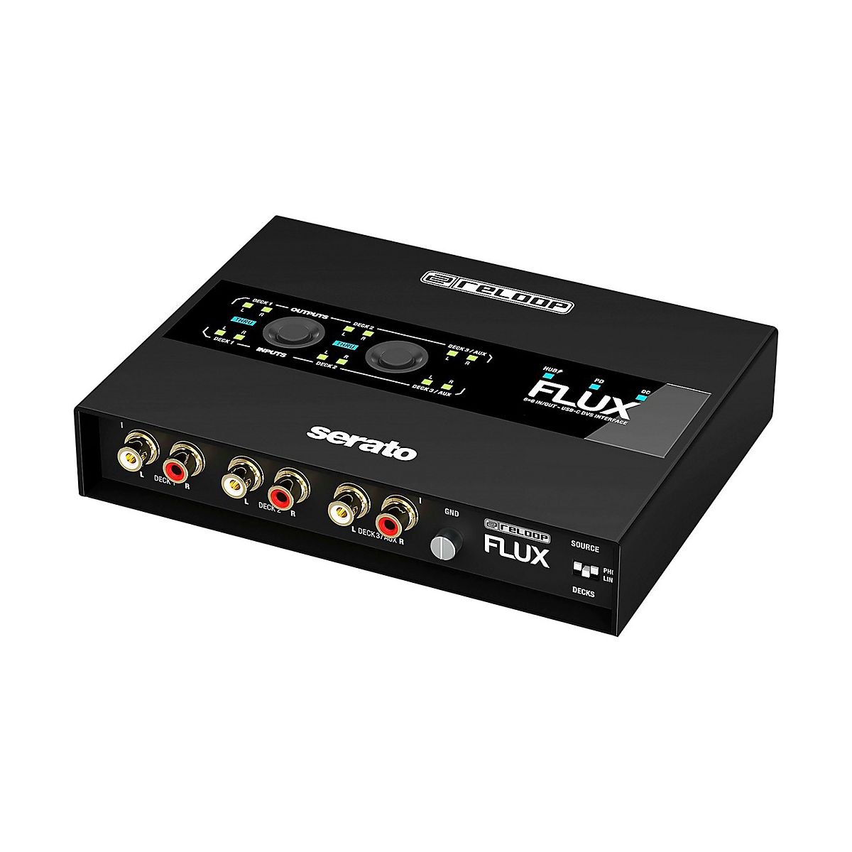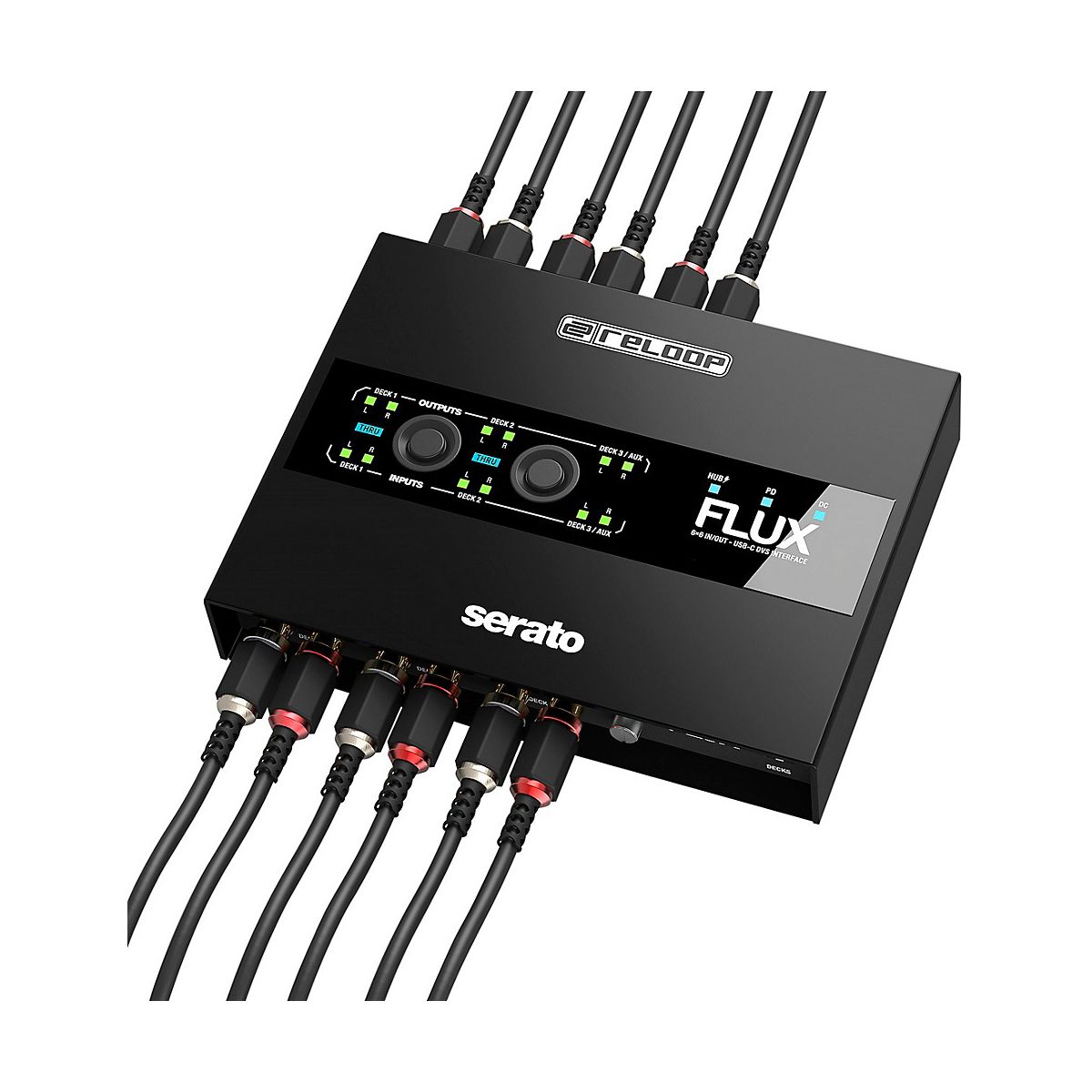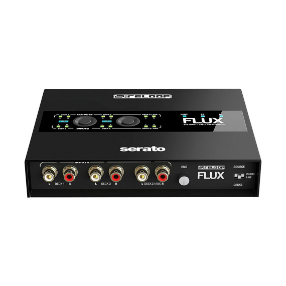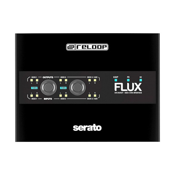 The Reloop Flux is a next-generation USB-C interface for using Serato DJ Pro with turntables, CDJs or other media players. The interface boasts superior audio qualities, a well-designed operating concept and a club-ready design. It can transform any conventional mixer into a professional digital vinyl system.Maximum FlexibilityThree stereo inputs provide DJs with maximum flexibility. Turntables, CDJs and similar can be used in any combination. The settings are adjusted using discreet DIP switches, which virtually eliminates any chance of accidental switching in the club. The interface includes three stereo outputs, including an AUX out that can be routed to Serato DJ Pro’s internal sampler. Gold-plated, corrosion-resistant RCA jacks ensure high-quality audio transmission. Full ControlThe ReloopFluxprovides the best possible routing overview thanks to clearly visible signal flow LEDs for all inputs and outputs and a Thru status indicator. Connection status (hub, PD, DC) LED indicators on the top of the interface provide additional control options. The Direct Thru buttons on the top of the interface enable to quickly and easily activate and disable Thru mode, which allows connected turntables and CDJs to be used conventionally. Navigation through the Serato software is no longer necessary.Hub InsideThe Reloop Flux includes a built-in 2-port USB-A hub for connecting MIDI controllers and other USB accessories. Aside from the expanded connection options, the hub reduces potential connection faults in a busy club environment by keeping the setup connected even without the laptop.Studio Quality — Anytime, AnywhereThe Reloop Flux offers studio quality in the club and wherever it's needed with 24-bit/96 kHz, high-quality digital/analogue converters and ultra-low latency. For this reason, it’s a superior DVS interface that can also be used as an audio interface in the studio.Always PoweredThe Flux is bus-powered by a computer, so there's minimal wiring required for audio and power cables. The DVS interface can also be powered by external power sources through the USB-C DC input, allowing turntables and CDJs to be used in Thru mode even without a computer connected. The Flux's second USB-C port provides Power Delivery support for other USB-C devices (max. 60 W), such as a MacBook.Robust and RoadworthyThe Reloop Flux interface has a durable metal housing with a scratch-resistant, black surface, ensuring a long service life even with heavy use. The extended edge design keeps the connections well-protected.Plug and Play for Serato DJ ProThe Reloop Flux unlocks the full version of Serato DJ Pro and Serato DVS. This means DJs can get up and running with the market-leading digital vinyl system in no time. Additional licenses are not necessary.
