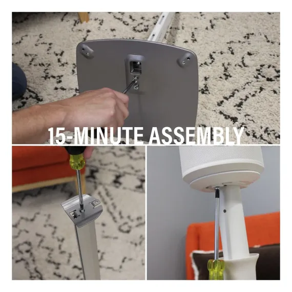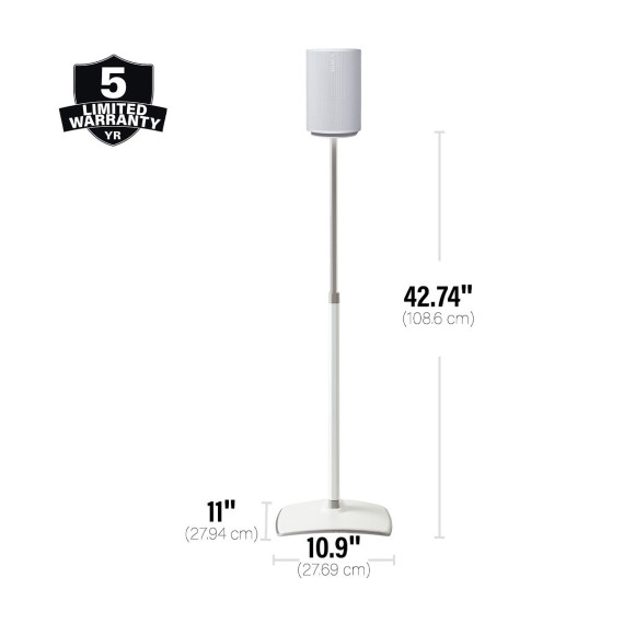 These SANUS Height-Adjustable Speaker Stands designed for Sonos Era 100 offer 17" of effortless sliding height adjustment cable management and a sleek design. These adjustable stands are sure to deliver optimal audio performance regardless of your listening needs. Constructed of durable steel and extruded aluminum this not only resists wear but also perfectly complements the aesthetics of the Sonos Era 100 for a sleek seamless look. Perfect for use in any setup be it home theater surround sound or ambient listening. For a cable-free look Sanus's Press Fit cable management technology secures and conceals cords down the back of the stands. Assemble easily in 15 minutes with a Phillips screwdriver this sleek stand will help get you the perfect sound for your space.