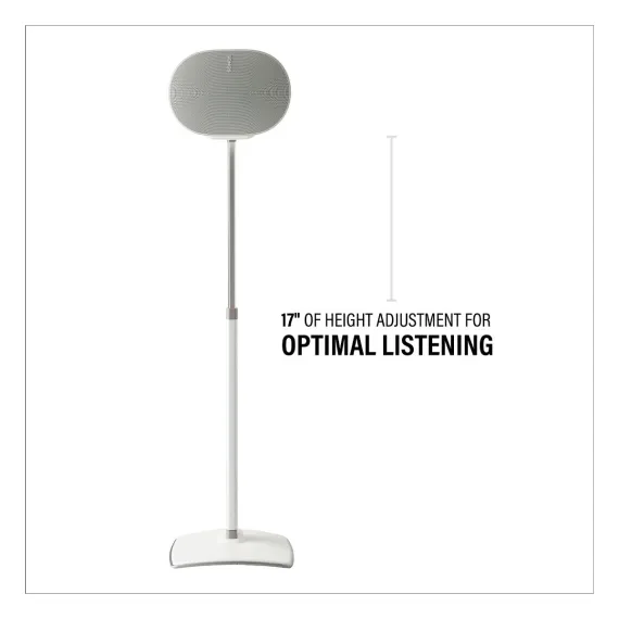 The SANUS Height-Adjustable Speaker Stands designed for Sonos Era 300 offers 17" of effortless sliding height adjustment cable management and a sleek design. These adjustable stands are sure to deliver optimal audio performance regardless of your listening needs. Constructed of durable steel and extruded aluminum this not only resists wear but also perfectly complements the aesthetics of the Sonos Era 300 for a sleek seamless look. Perfect for use in any setup be it home theater surround sound or ambient listening. For a cable-free look Sanus's Press Fit cable management technology secures and conceals cords down the back of the stands. Assemble easily in 15 minutes with a Phillips screwdriver this sleek stand will help get you the perfect sound for your space.