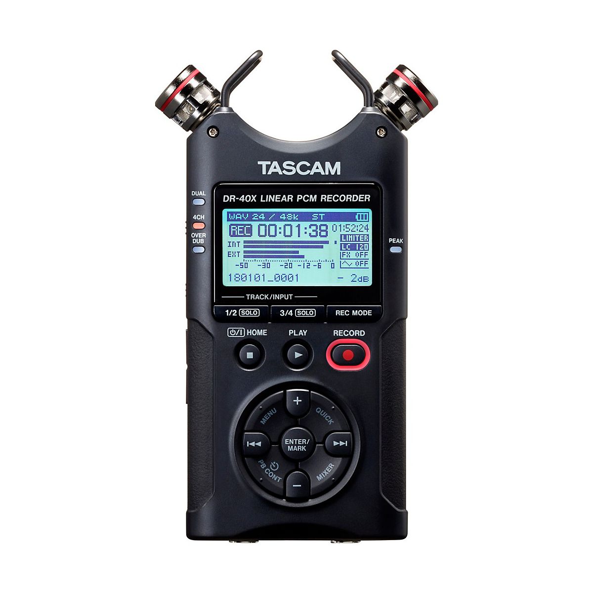The DR-40X is a versatile four-track audio recorder for cinema, music, podcasting and any other application where clear capture and quality overdubbing is critical. The easy-to-use compact design integrates a high-performance feature set and versatile audio I/O.Professional I/O for live capture or line level inputDual Neutrik XLR/TRS combo jacks support both mic-level and +4dBu line-level. The DR-40X inputs can accept balanced microphone or line level from mixers or the front-of-house console. The microphone preamp also includes +48V phantom power and plenty of gain for detailed recordings using condenser microphones, as well as electret microphones. Using the stereo built-in microphones, can capture ambient sound of the surroundings while recording direct from an external console—ideal for live performance.Record clear audio anywhereDR-40X allows high-quality recording with its stereo built-in condenser microphones. Every detail is captured from a whisper all the way up to 125dB. The built-in microphones are adjustable unidirectional microphones for recording in an X/Y pattern for tight stereo imaging, or in an A/B pattern for a more ambient recording.Easy to operateTASCAM created a totally revamped user interface, making it easy to access recording, adjusting levels, deleting takes, adding markers and other common functions with just the click of a thumb. And DR-40X now includes a powerful bright-white backlit display that’s easy to see even in the brightest sunlight.Turn room into a studio The DR-40X offers a studio-quality 2 in/2 out USB audio interface, making the DR-40X a perfect fit for livestreaming, podcasting and digital audio workstations. Built-in microphones operate as USB microphones without complicated settings changes.Multi-language interface insideMulti-language menus in English, Spanish, French, Italian, German, Russian, Chinese, Korean, Japanese and Portuguese are included.Dictation mode for voice recording and transcription playbackIn addition to its capability to capture crisp voice recording, DR-40X can help with its instant Jump back function, variable Speed function and equalizer preset for human voice.Safety trackFilmmakers and videographers often experience sudden audio volume spikes during filming. An actor could suddenly scream, or a documentary subject could do almost anything. DR-40X has a Dual Recording mode that captures a copy of take but at a lower level, as a safety track in case of sudden distortion.Four-track recording mode In addition to normal stereo channel recording and Dual Recording mode, DR-40X has “4CH Mode” that can record two different stereo feeds simultaneously. The combination of the sources are flexible; recording the built-in microphones along with a pair of external mics, such as close-up and ambient microphones, or recording the built-in mics along with a balanced line input, such as the feed from a mixer along with the sound in the environment.Never miss a takeDR-40X is equipped with Auto Recording functionality to automatically start recording when an input signal is detected, and Peak Reduction technology to guard against sudden spikes in loudness. Recording modes include Overwrite Mode, which allows users to select a precise record drop-in time for replacement recording with one level of undo, and Nondestructive Overdubbing allows to record new sounds onto an existing recording while leaving the original file unaffected. Record higher quality for longerThe DR-40X allows studio-quality linear PCM recordings up to 96kHz/24-bit WAV/BWF format, as well as memory-friendly MP3 format