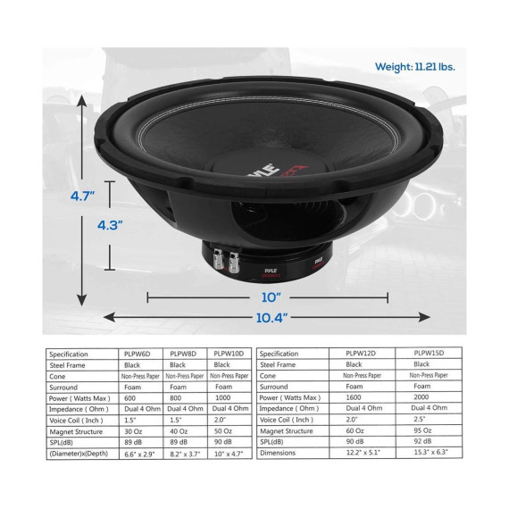 The Pyle PLPW12D 12" Car Subwoofer delivers thunderous bass performance thanks to its dual voice coil design and powerful 1600-watt peak power handling. Built with a 2-inch 4-layer voice coil, this subwoofer is designed to handle high temperatures and heavy usage, making it perfect for high-output car audio systems.