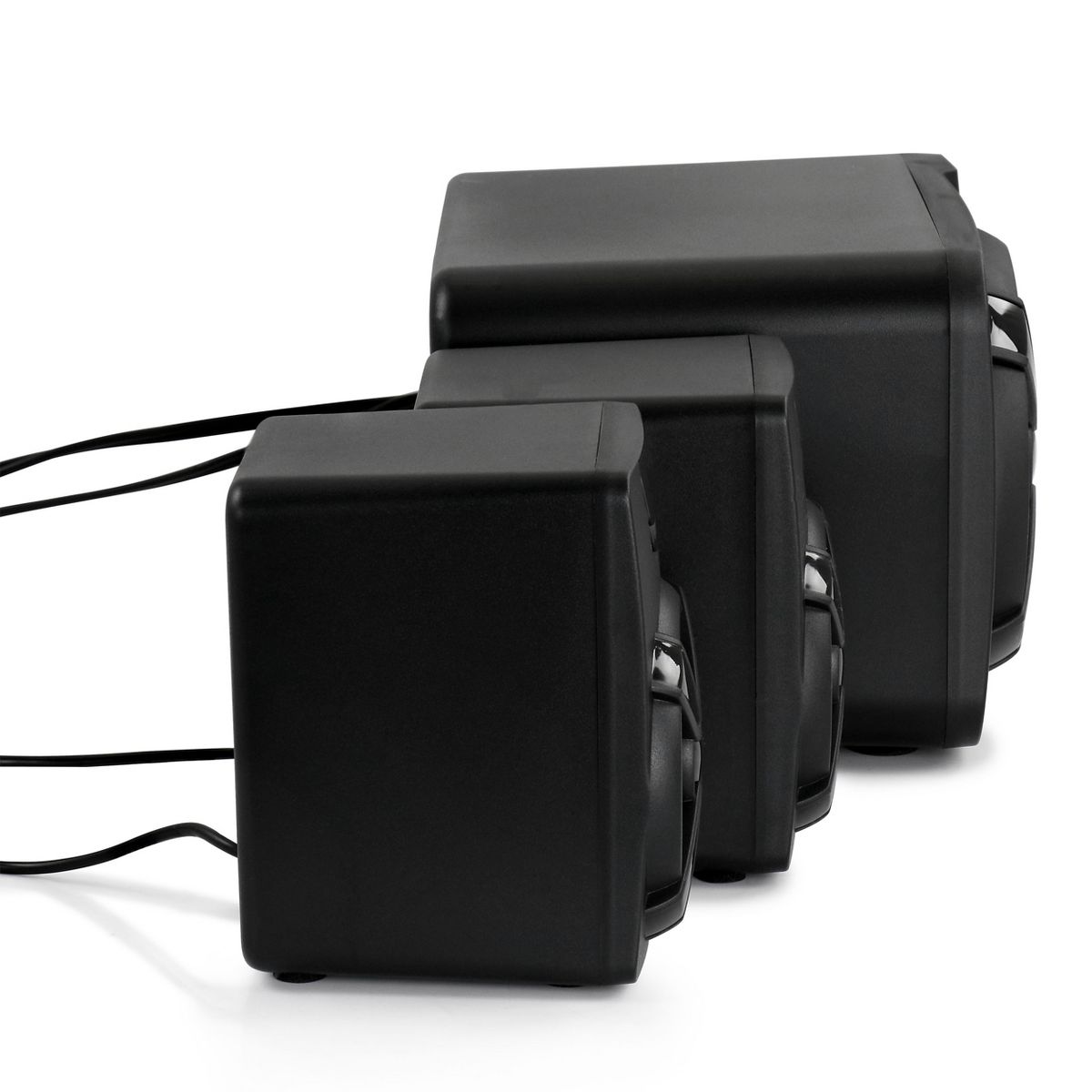 Immerse yourself into gameplay or relax with some casual downtime with this set up. With a high quality dual speaker and subwoofer, and colorful LED accent lights, every moment is felt and heard. Compact size is perfect for your desk top, designed with a sleek matte finish and boxy shape. Rotary dials control volume, treble, and bass. Set comes with two speakers, one subwoofer, and one split AUX and USB power cord. Includes: Two speakers One Subwoofer