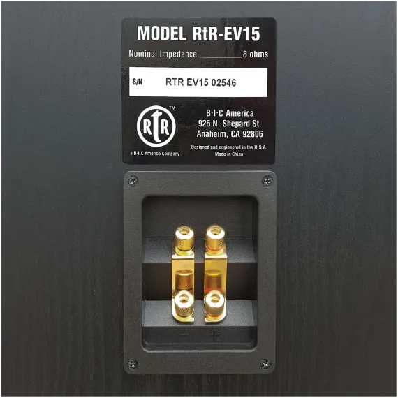 The BIC America RtR Eviction Series RtR-EV15 has a heavy-duty 15-in. woofer as well as a magnet that is twice the size of the BIC RtR-1530 magnet! It also incorporates a sealed 5-1/4-in. midrange and mid-high frequency horn tweeter that enables extended output to 116 dB. The outstanding power-handling capability of the RtR-EV15 can accept the output of powerful amplifiers without a whimper and look great while doing so! This floor-standing speaker is also bi-ampable. There are some occasions when it is advantageous to drive the woofer separately from the mid-range and tweeter. This process (bi-amplification) is enabled by 2 sets of gold-plated input terminals—1 set connected to the woofer circuit and the other to the crossover circuit for the mid speaker and the horn tweeter. Gold-plated removable straps connect the two sets of inputs for conventional single-amplifier operation.