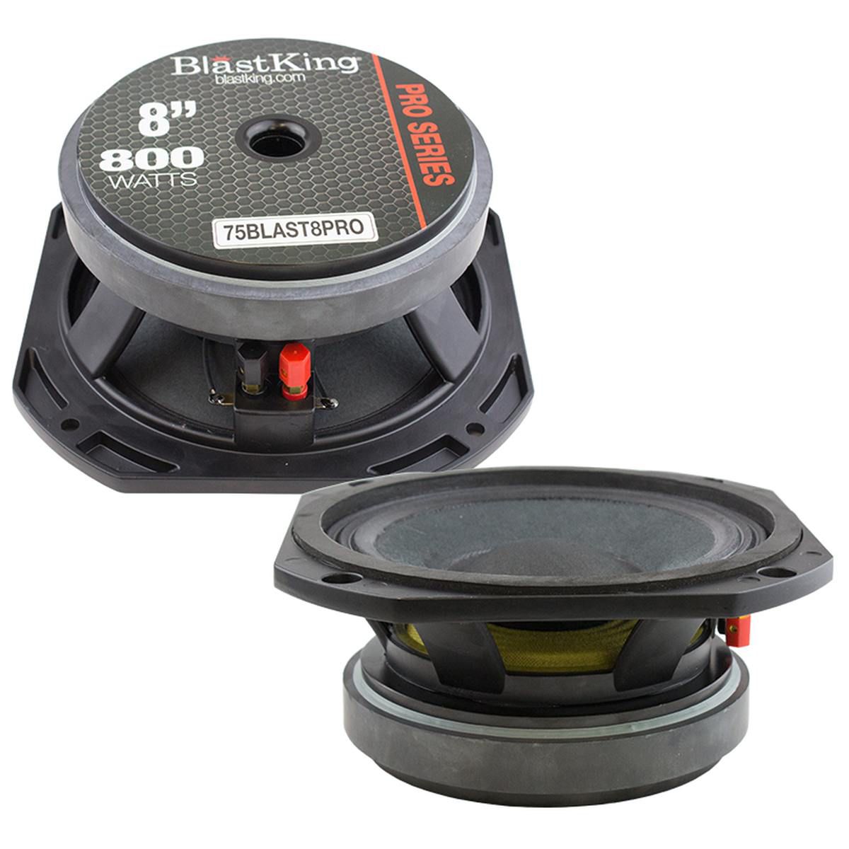 The BlastKing Blast Pro series features our top of the line precision transducers. Starting from our Blast8 Pro all the way up to our Blast18 Pro, our high power transducers are all made in a die-cast aluminum basket, with a paper cone, and mounted on a ferrite magnet with a 4-in copper voice coil. The high power rating, great frequency response, and low distortion make the Blast Pro series the perfect choice for both live and recorded music applications. The Blast8 Pro is the perfect option when you are looking for power and clarity in a compact application. Featuring a 2-in aluminum voice coil, you can be assured the Blast8 Pro will put out clear mid-bass frequencies in high power applications making it great for 2-way compact enclosures.
