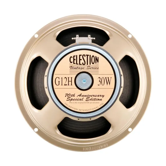 The Celestion G12H is a reissue of their 12" guitar speaker that was re-released in 1994 for the Celestion 70th anniversary. Loud and proud thanks to its heavy magnet structure, the G12H provides a fusion of the Vintage 30 and the Greenback speaker characteristics, producing a thick, warm and syrupy sound while still retaining a tight and focused bottom end. When played clean the G12H remains clear and musical without ever sounding harsh. In overdrive, pick attack is vividly articulated with sustained notes trailing off into warm harmonic tones.