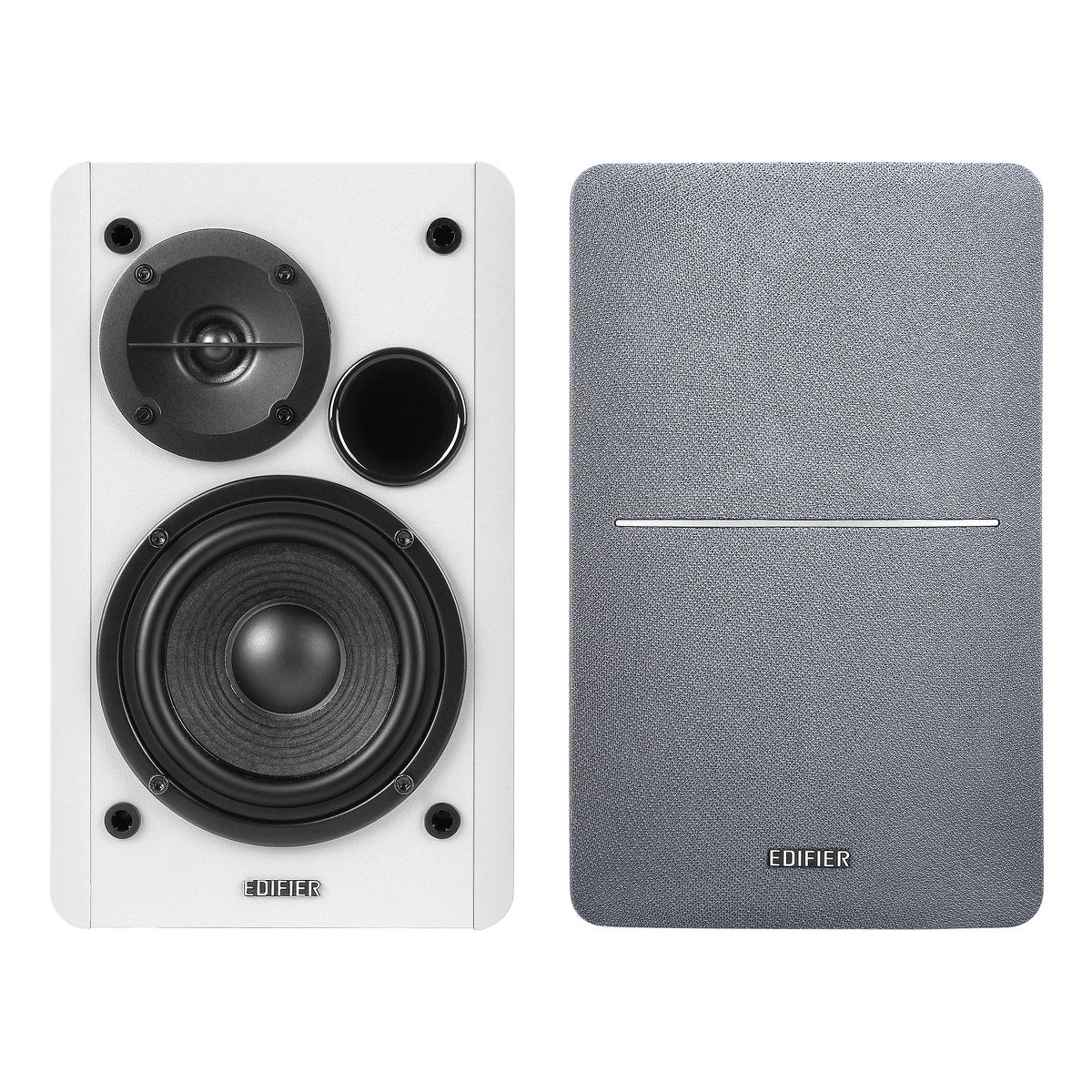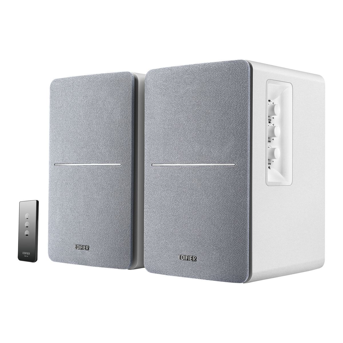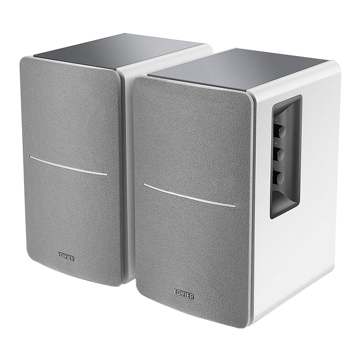 The Edifier® R1280T Powered Bookshelf Speakers have combined a retro look with a modern sense of audio quality. Producing a total 42 watts of sound (21 watts RMS each), the R1280T is the ideal well-rounded stereo speaker system as each speaker contains a 4-in. bass driver and 0.5-in. tweeter to offer a sound that is full of presence and depth. You can connect to 2 devices at the same time via its dual RCA inputs - no plugging, unplugging, or switching out needed. Designed for enhanced bass, the R1280T bookshelf speaker system is calibrated with a flared bass reflex port, resulting in rich detailed sound. Personalize your listening experience with the bass, treble and volume dials on the active bookshelf speaker. A compact-sized handy remote control is included. You can adjust the volume and set the speakers to mute when needed without having to reach the speakers—power and perfection at your fingertips! The wood finish with its rounded corners has a retro appeal, making them the ideal speakers for use with your turntable. The R1280T is also an ideal choice for use with PCs, laptops, tablets, cell phones, etc. Enjoy the advancements in modern day audio with speakers that bring back the warmth of yesteryear.
