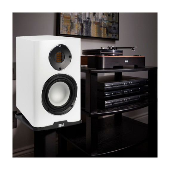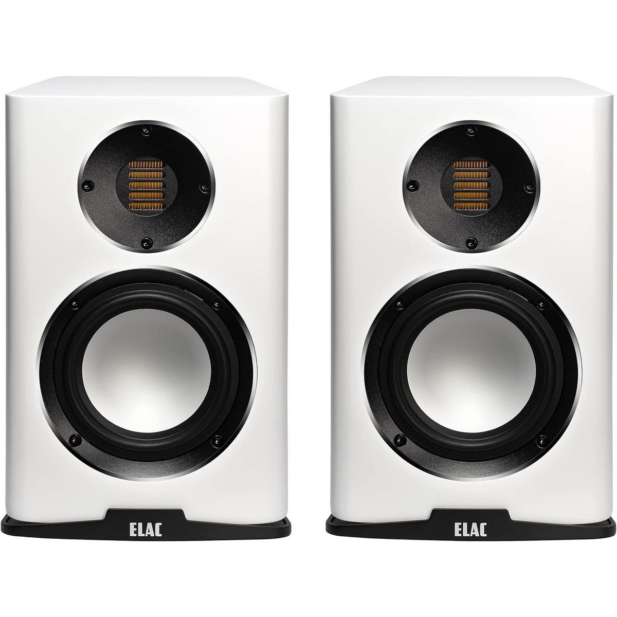 The Carina Bookshelf Satin Black Surround Sound Speakers from ELAC offer a fresh look and sound, designed to deliver remarkable audio quality even in small spaces. These compact home stereo speakers feature a JET tweeter, known for its exceptional clarity, dynamic range, and frequency response. The speakers also utilize a proprietary compound curvature aluminum cone woofer, seamlessly blended with a sophisticated multi-element crossover for an organic, lifelike sound. The JET tweeter also reduces sound distortion, offering better sound reproduction. The speakers' 5-1/4" woofer moves the cone breakup mode outside of the operating range, improving bass reproduction. With a 6-ohm impedance, these speakers offer cleaner sound compatible with nearly all amplifiers and receivers. The Carina speakers also have a downward firing port for flexible room placement and even bass distribution. Finished with satin paint and a cast aluminum base, these speakers add a touch of sophistication to any home interior