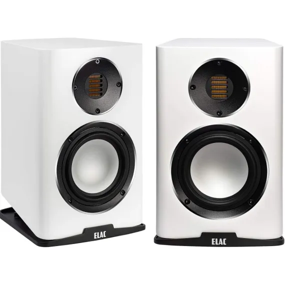 The Carina Bookshelf Satin Black Surround Sound Speakers from ELAC offer a fresh look and sound, designed to deliver remarkable audio quality even in small spaces. These compact home stereo speakers feature a JET tweeter, known for its exceptional clarity, dynamic range, and frequency response. The speakers also utilize a proprietary compound curvature aluminum cone woofer, seamlessly blended with a sophisticated multi-element crossover for an organic, lifelike sound. The JET tweeter also reduces sound distortion, offering better sound reproduction. The speakers' 5-1/4" woofer moves the cone breakup mode outside of the operating range, improving bass reproduction. With a 6-ohm impedance, these speakers offer cleaner sound compatible with nearly all amplifiers and receivers. The Carina speakers also have a downward firing port for flexible room placement and even bass distribution. Finished with satin paint and a cast aluminum base, these speakers add a touch of sophistication to any home interior