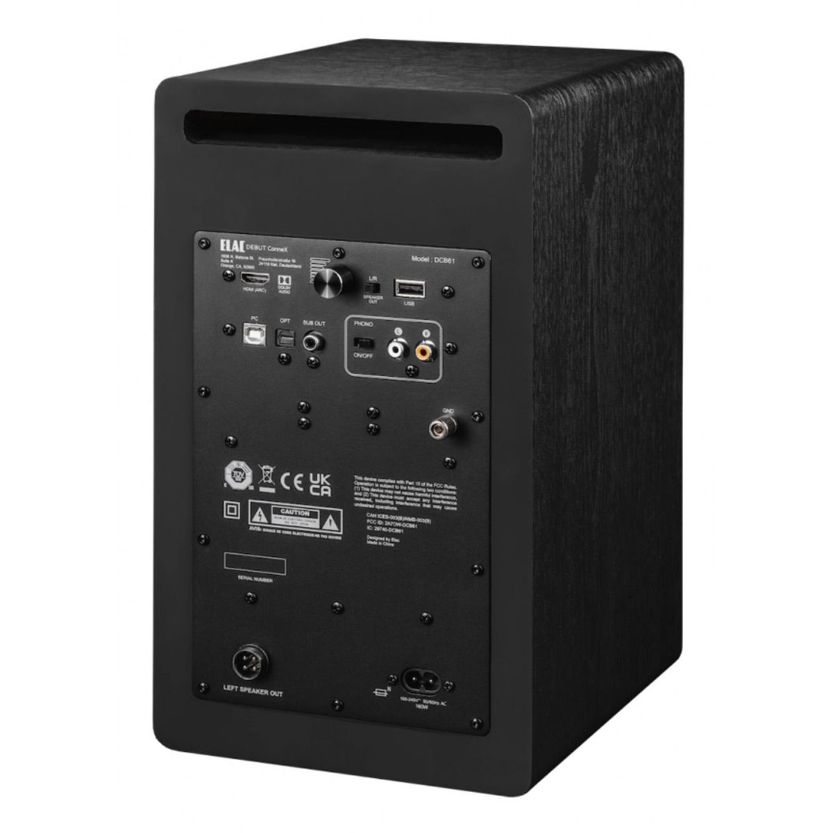 Custom WooferThe DCB61 is equipped with a long excursion 6 1/2” woofer designed to deliver powerful output with extended bass response. This high performance woofer enhances low-frequency depth and impact ensuring rich dynamic sound with greater clarity and precision whether you’re listening to music or watching movies.TweeterThe DCB61 is equipped with a custom-engineered waveguide optimizing dispersion and directivity for a more precise balanced high-frequency response. This design ensures greater clarity and detail delivering an immersive and accurate listening experience.Elac ConneX APPThe ELAC Connex Speaker features a custom-designed app for effortless setup and control. Easily fine-tune EQ settings optimize placement adjust Auto On and manage volume—all from your smartphone. Experience seamless configuration and personalized sound at your fingertips.
