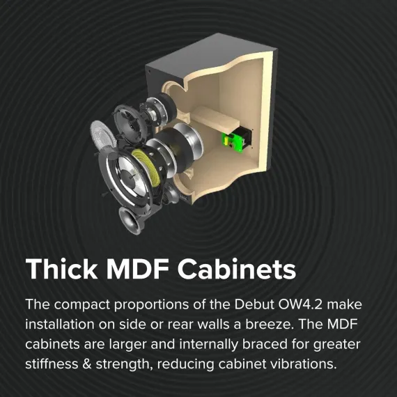 Experience the ultimate surround sound system with the debut Ow4.2, designed specifically for those who demand high performance but have limited space. Its compact size enables easy installation on side or rear walls, making it a versatile addition to your home entertainment setup. Despite its small footprint, this speaker delivers a huge sound dimensionality that enhances your audio experience. It is equipped with a 4" woven aramid fiber bass driver and a 1" soft-dome tweeter, ensuring deep, impactful bass and smooth, extended highs for both movies and music. With an easy-to-drive 6-Ohm nominal impedance, it is compatible with almost all AV receivers and stereo amplifiers. The speaker also features bottom firing ports, allowing for greater flexibility in room placement, even up against a wall. It comes with wall mounting hardware, making installation a breeze. With a 70Hz - 35kHz frequency response, the Ow4.2 ensures a wide range of accurately reproduced sound, making it a barely visible but highly audible addition to your system.