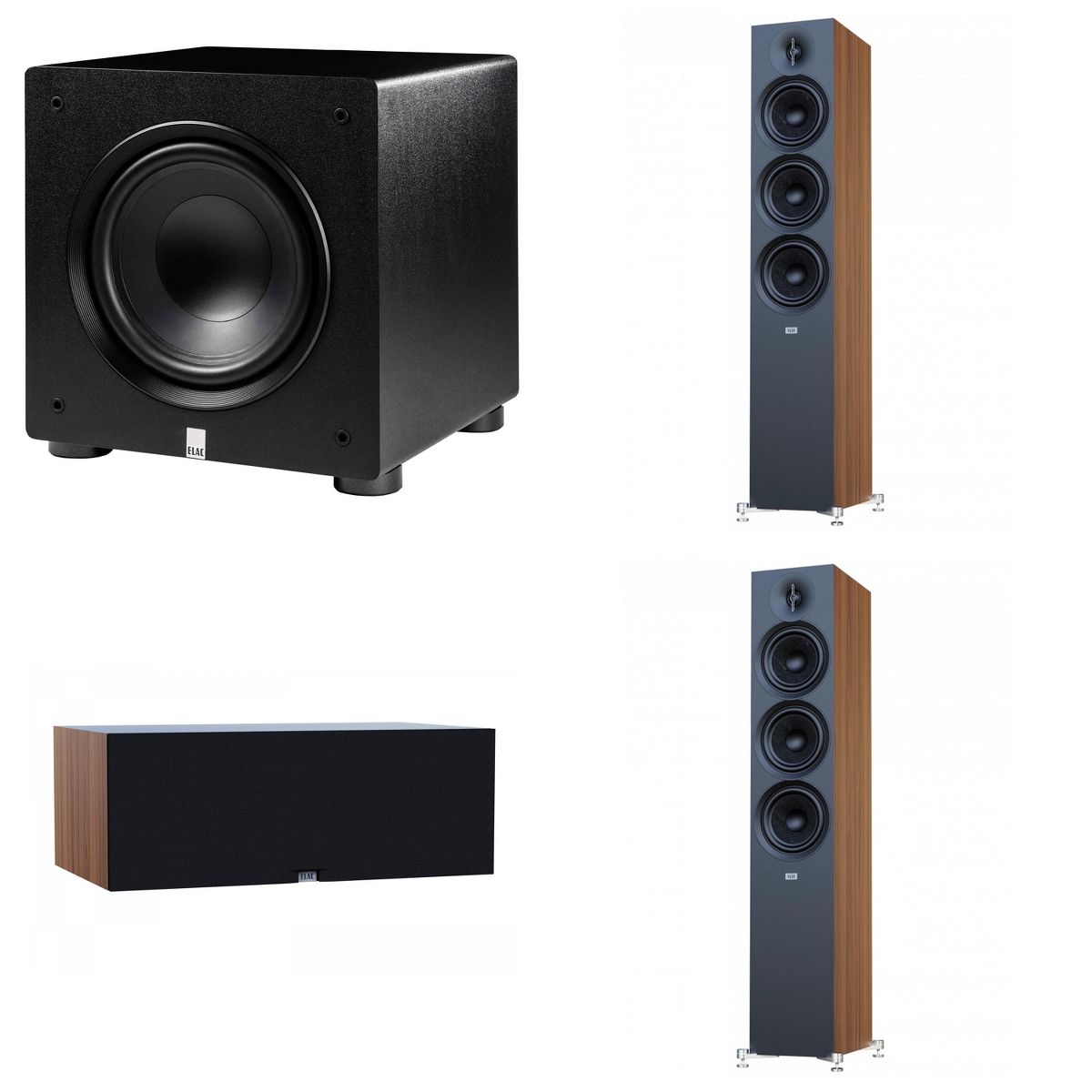 Elac Debut 3.0 Walnut 6.5 Inch Towers With 6.5 Inch Center And Elac Varro 10 Inch Subwoofer