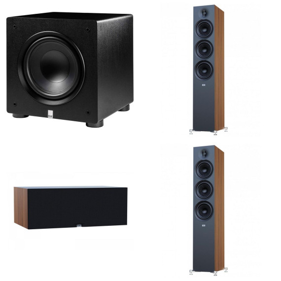 This bundle includes the Elac PS250-BK 10" 250 Watt Powered Subwoofer with Auto-EQ, ELAC DF63-WN 6.5" Walnut Floor Speaker, and ELAC DC63-WN 6.5" Walnut Center Speaker. The Elac PS250-BK subwoofer features BASH Amplification, Advanced App Control, and Auto EQ, app-controlled with a 10" Treated Paper Woofer, and 250/500 Watts RMS/Peak power. The dimensions are 381mm Height, 360mm Width, 360mm Depth, and 16.4 Kg Weight. The ELAC DF63-WN floor speaker has a 3-Way Bass Reflex design, with a 1" Aluminum Tweeter, newly developed Aramid Fiber Woofers, and a CARB2 Rated MDF Cabinet. It measures 195mm Width, 1094mm Height, 268mm Depth, and weighs 17.6 Kg. The ELAC DC63-WN center speaker is a 2-Way Sealed design with a 1" Aluminum Tweeter, Aramid Fiber Woofers, and a CARB2 Rated MDF Cabinet. Its dimensions are 482mm Width, 172mm Height, 234mm Depth, and 8.7 Kg Weight. Enhance your home theater or music setup with this powerful, high-performance audio bundle for an immersive sound experience like never before.