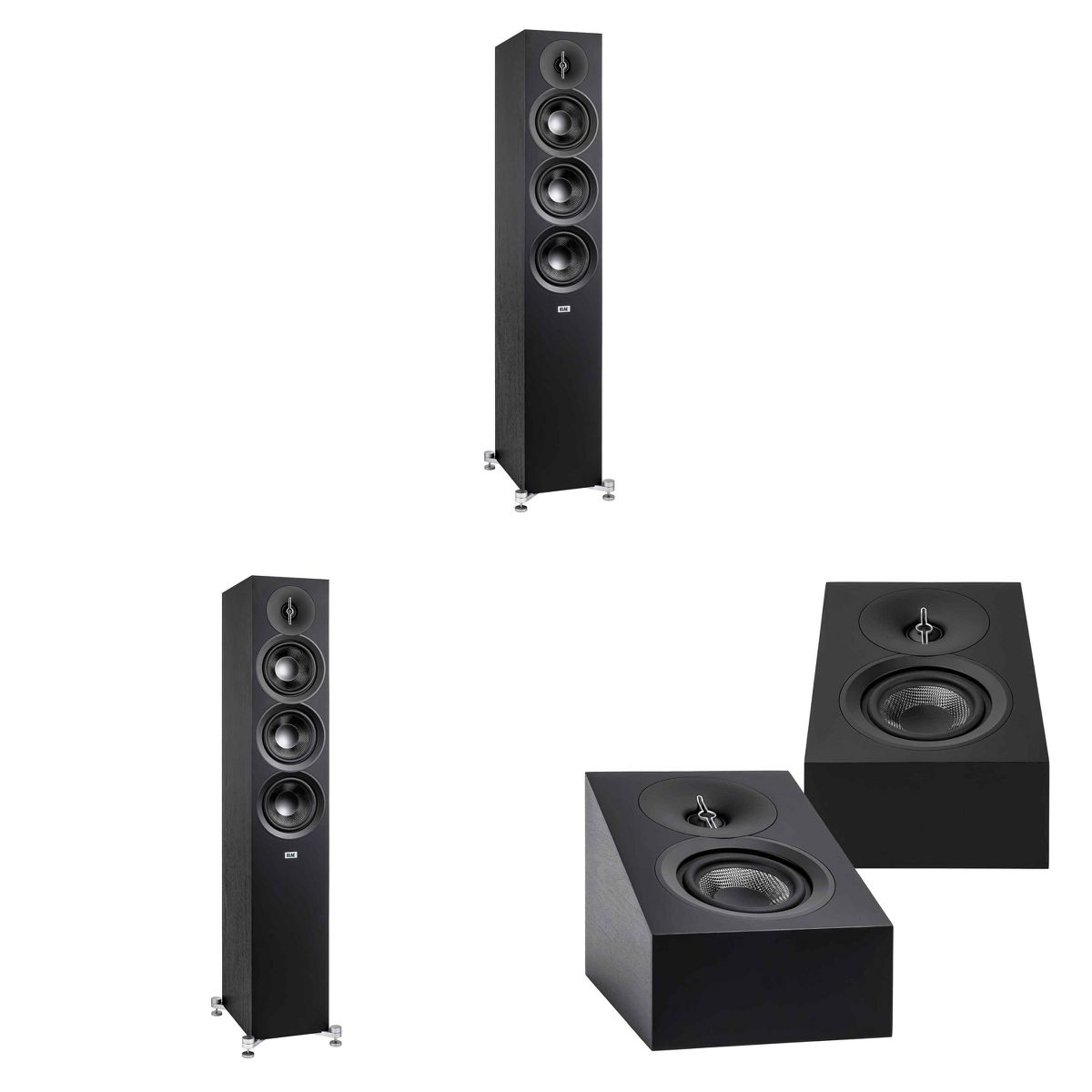 This bundle features 2x Elac DF53-BK Floor Speakers and 1x ELAC DA43-BK Atmos/On-Wall Speaker. The Elac DF53-BK floor speaker offers immersive audio quality with a custom aluminum tweeter, aramid fiber woofers, and stunning aesthetics in a 3-way, bass reflex design. Its 1” aluminum dome tweeter and 5 1/4” aramid-fiber midrange and dual 5 1/4” woofers provide a frequency response of 38Hz to 38Khz, perfect for a 2-channel or multi-channel setup. The cabinet is CARB2 rated with a black ash finish, measuring 6.8” W x 40.6” H x 9.7” D and weighing 34.6 lbs. The ELAC DA43-BK Atmos/On-Wall Speaker delivers Dolby Atmos technology for a 3-D audio experience, with a custom tweeter, aramid fiber woofer, and contemporary design. It features a 1” aluminum dome tweeter and 4.0” aramid-fiber woofer, with frequency responses of 73Hz to 38Khz for Atmos and On-Wall setups. The cabinet is CARB2 rated, black ash finished, and measures 6.8” W x 6.7” H x 9.7” D, weighing 7.3 lbs. Transform your audio setup with these premium speakers for a captivating sound experience.
