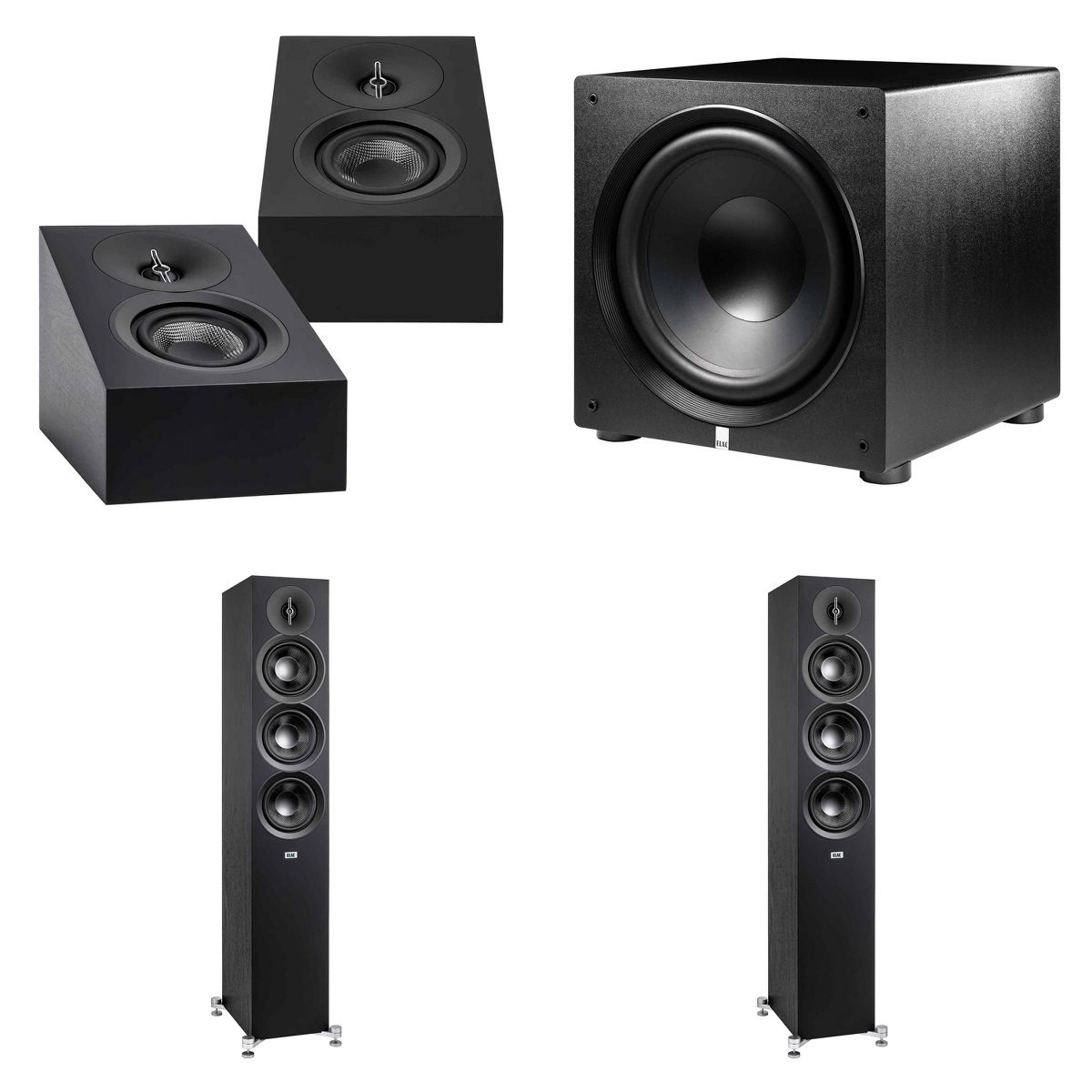 Elac DF53-BK - Debut 3.0 5.25" Floor Speaker - Black (Pair), ELAC DA43-BK Debut 3.0 - DA43-BK Atmos / On Wall speaker, and Elac PS500 Subwoofer