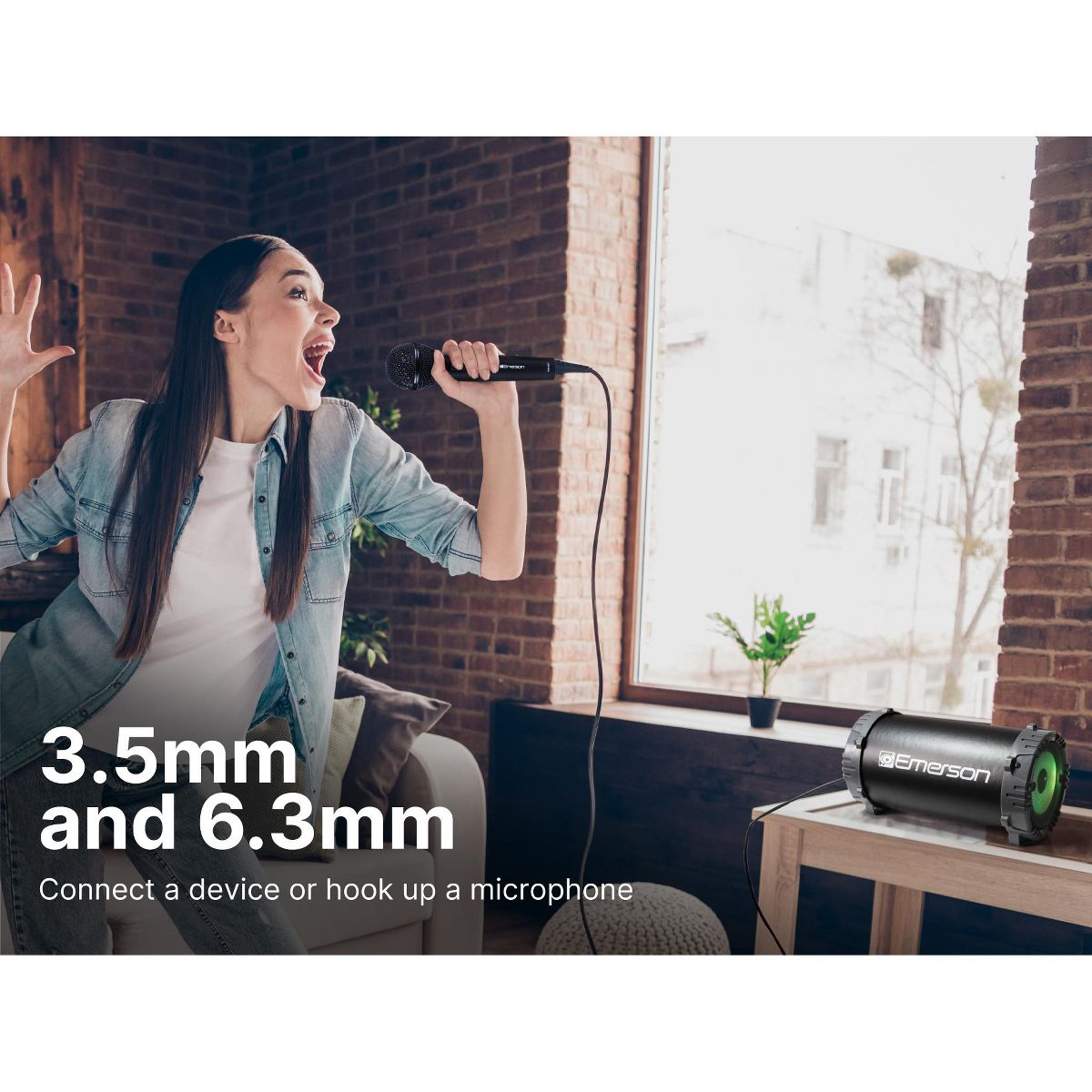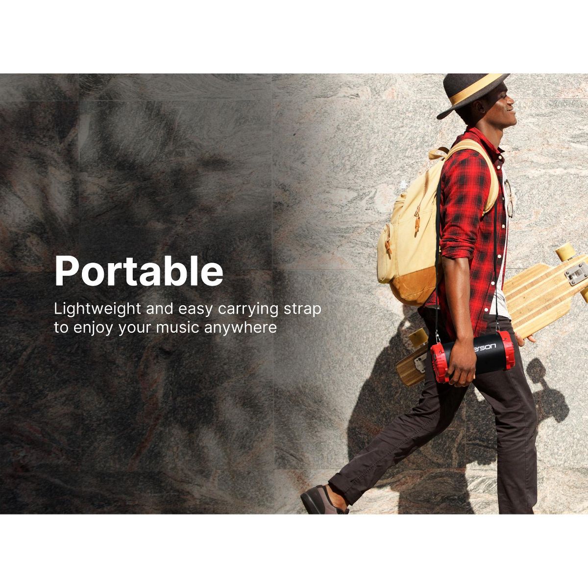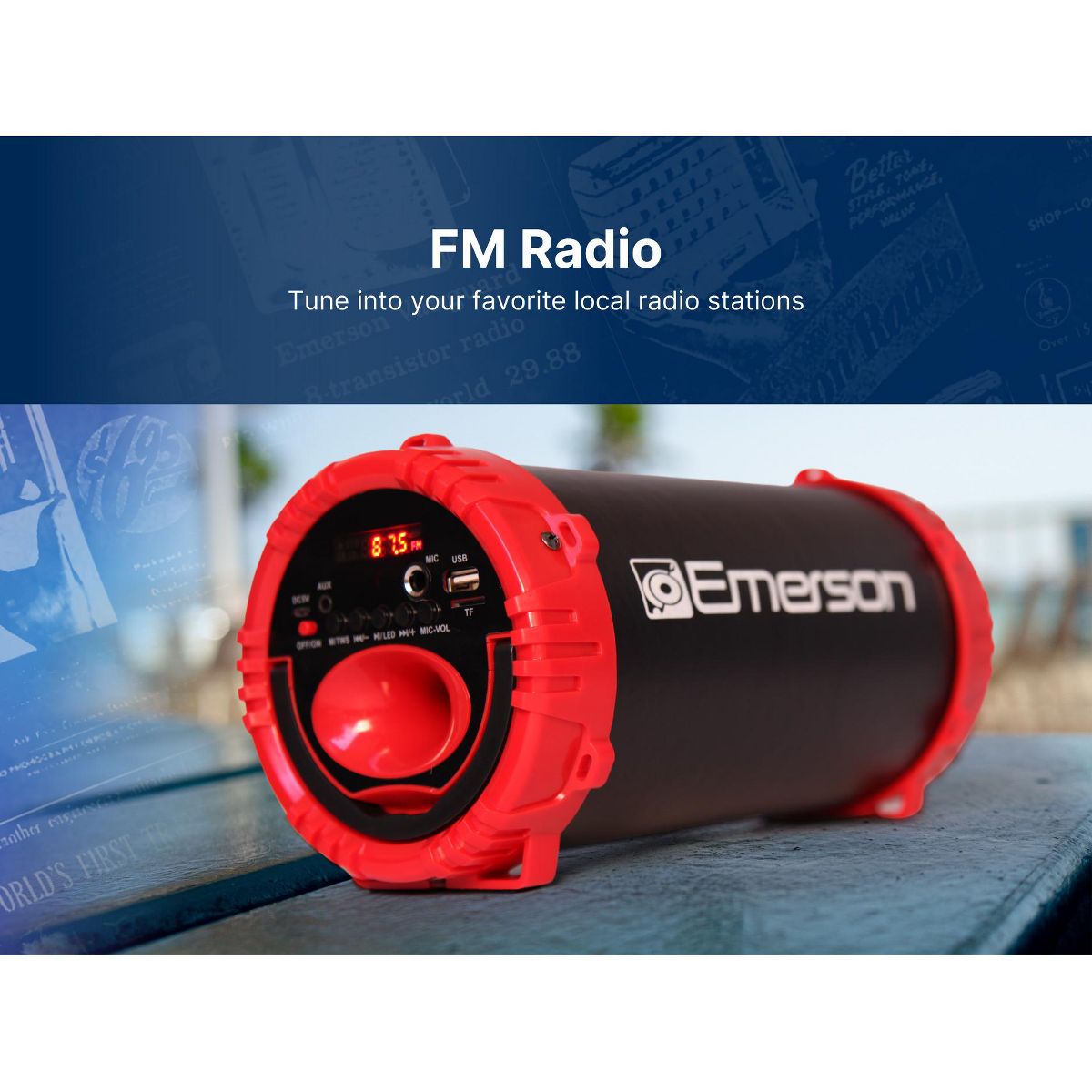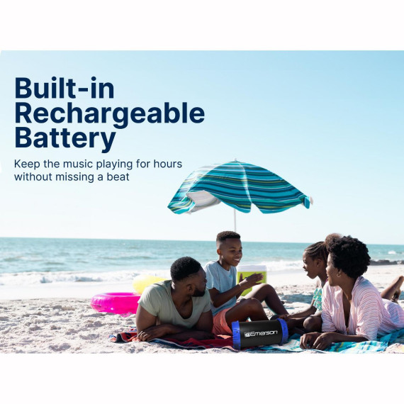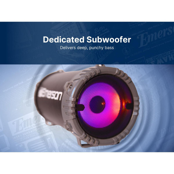 The Portable Bluetooth® Speaker with Carrying Strap by Emerson™ takes the party to the next level. You can play music with any Bluetooth-enabled device, or if you want a wired connection, you can use the 3.5mm aux input. A dedicated sub-woofer gives you the deep bass sound to give your music extra depth.