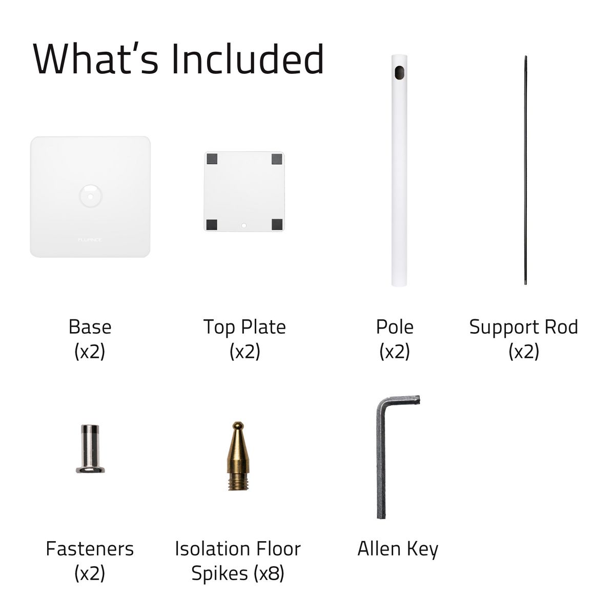 What's Included: 2x Base, 2x Top Plate, 2x Pole, 2x Support Rod, 2x Fasteners, 8x Isolation Floor Spikes, Allen Key, Quick Start Guide, 1 Year Manufacturer's Warranty