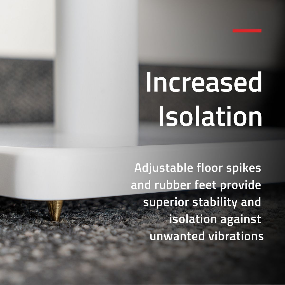 Engineered to protect against unwanted vibrations and resonance using adjustable floor spikes and rubber feet that decouple your speakers from their resting surface. Additional rubber pads on the top plate provide a dual isolation barrier for a more controlled and focused audio performance.