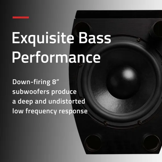 Utilizing unique down-firing 8"" subwoofers that reproduce exceptionally deep and undistorted bass response so you can experience a lively full range performance.