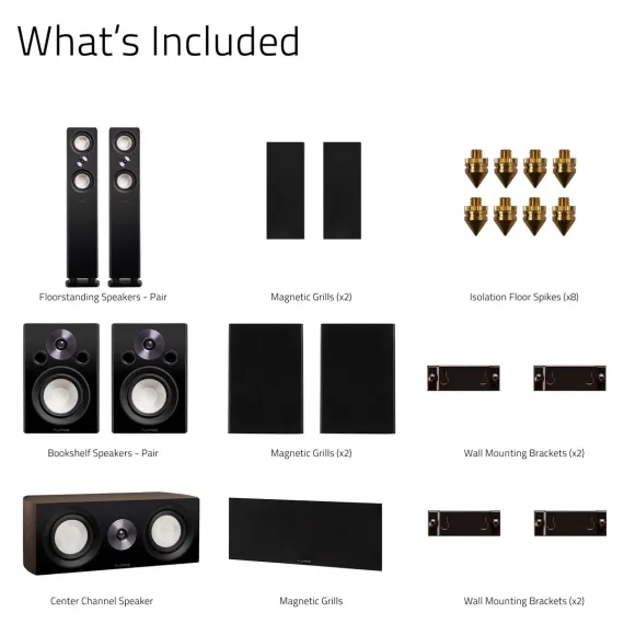 What's Included: 2x Hi-Fi Floorstanding Speakers, 2x Hi-Fi Bookshelf Surround Speakers, 1x Hi-Fi Center Channel Speaker, 8x Isolation Floor Spikes, Instruction Manual