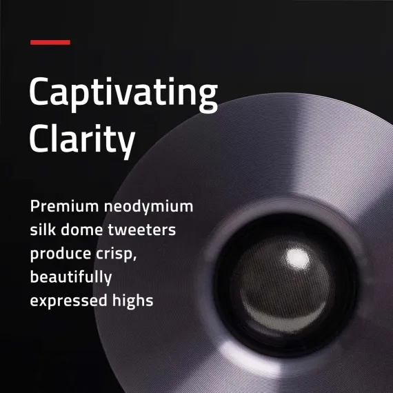 The premium neodymium silk dome tweeters produce crisp, natural high frequencies while providing spacious off axis dispersion allowing you to hear beautifully expressed highs anywhere in the room.