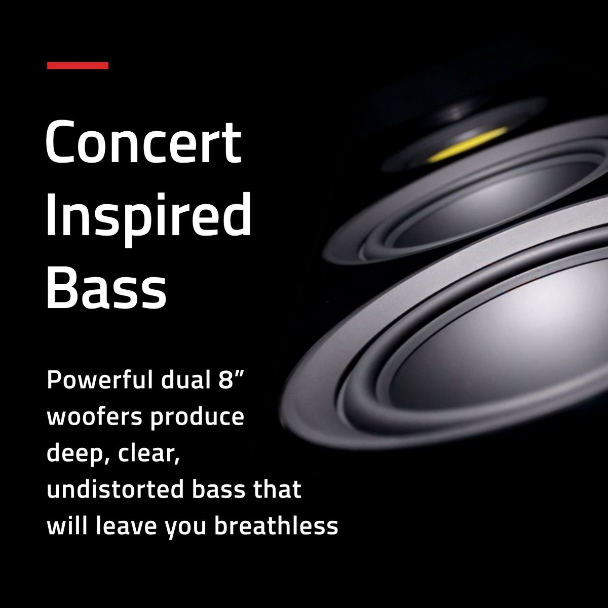 From the lowest, deepest bass beats to the loudest car crash, you will experience every rumble. Lows kick in at 35Hz and hold their own throughout. The powerful 8" long throw woofers produce deep, clear, undistorted bass.