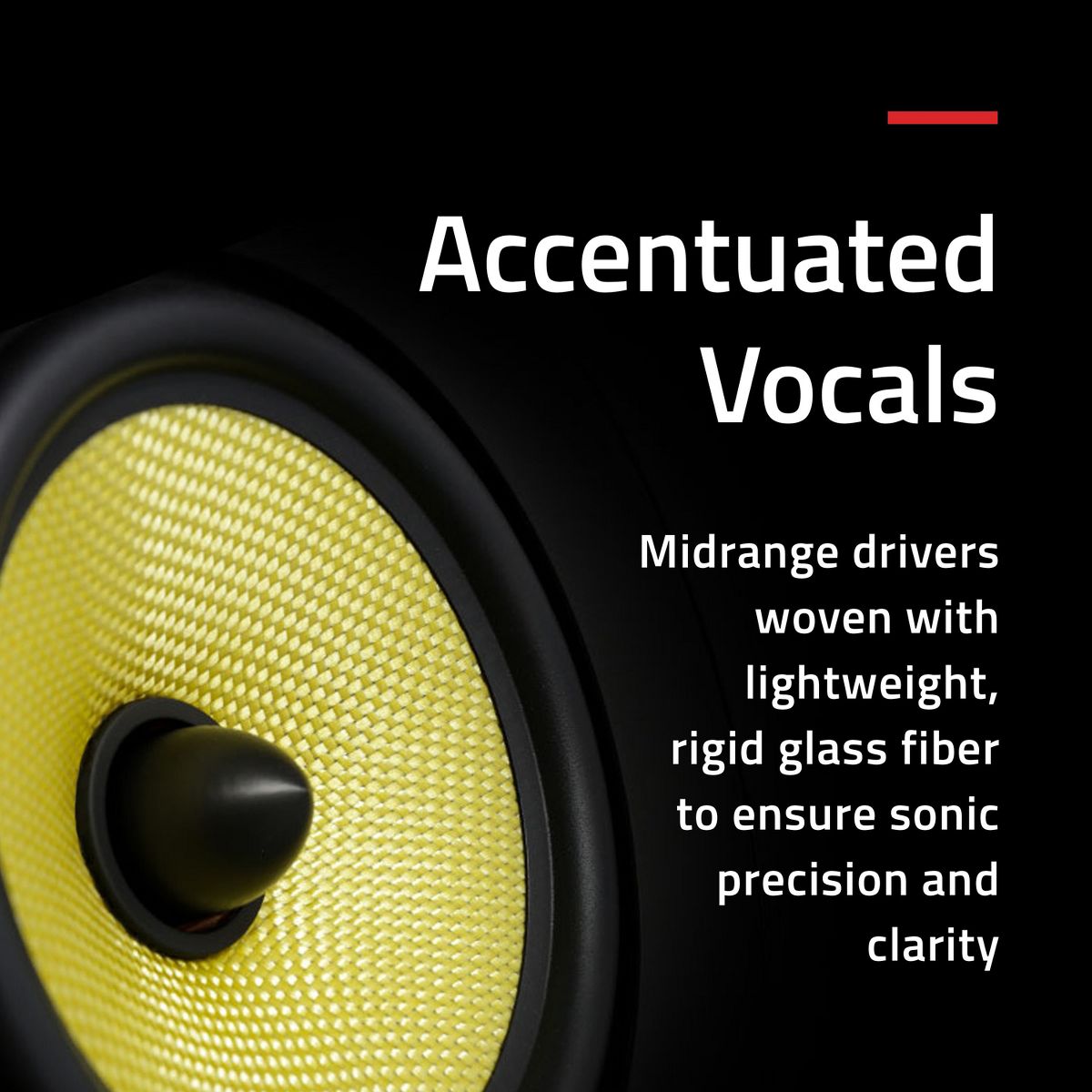The midrange drivers are woven with light weight yet rigid glass fiber for optimal linear movement to handle the highest volume levels and still ensure sonic precision. The pointed dome allows sound waves to travel directly from the center of the cone for an enhanced soundstage.