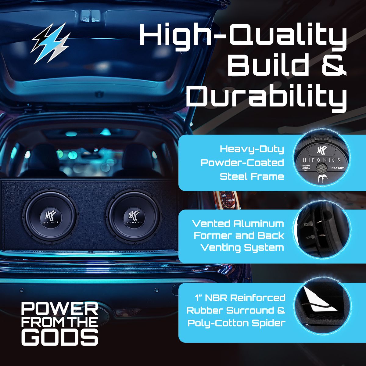 The HFX12D4 subwoofer offers superior sonic accuracy, intense high power sound quality with exotic build materials and outstanding good looks. The Hifonics HFX12D4 12 inch car subwoofer features an 800 watt peak/400 watt Rms, high excursion rubber surround, large air cooled magnet assembly, high energy magnet and ultra ridged chrome stamped steel basket. This Dual Voice Coil 4 Ohm Subwoofer is an incredible value and includes a large air cooled magnet assembly.